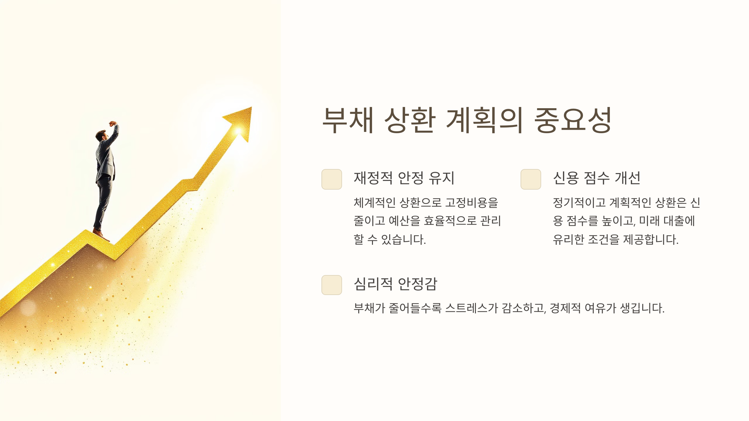 부채는 필요할 때 큰 도움을 주지만, 잘못 관리하면 재정적 어려움으로 이어질 수 있습니다. 다음은 부채 상환 계획의 중요성입니다: