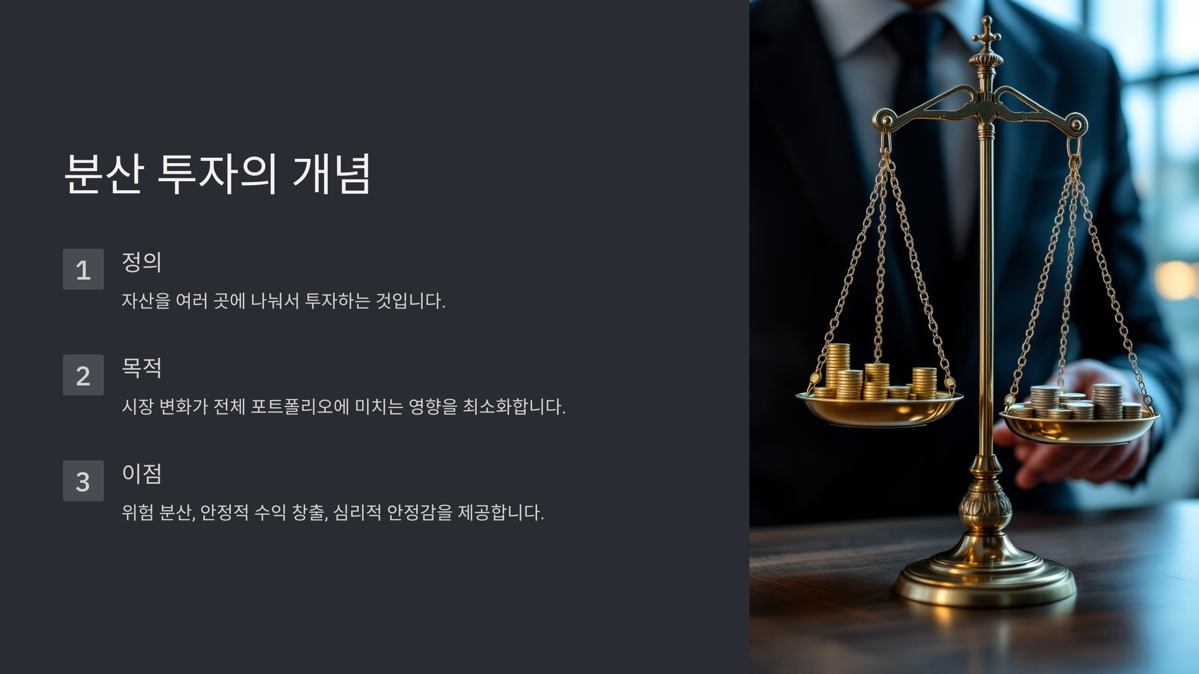 분산 투자는 말 그대로 자산을 여러 곳에 나눠서 투자하는 것을 의미합니다. 투자자들은 자산을 여러 유형으로 나누고, 이들 각각이 시장 상황에 따라 다르게 움직일 수 있다는 점을 활용합니다. 예를 들어, 주식 시장이 하락해도 채권 시장은 안정적일 수 있고, 반대로 주식이 상승할 때 채권이 하락할 수 있습니다. 이처럼 한쪽 시장의 변화가 전체 포트폴리오에 미치는 영향을 최소화하려는 것이 분산 투자의 목적입니다.
