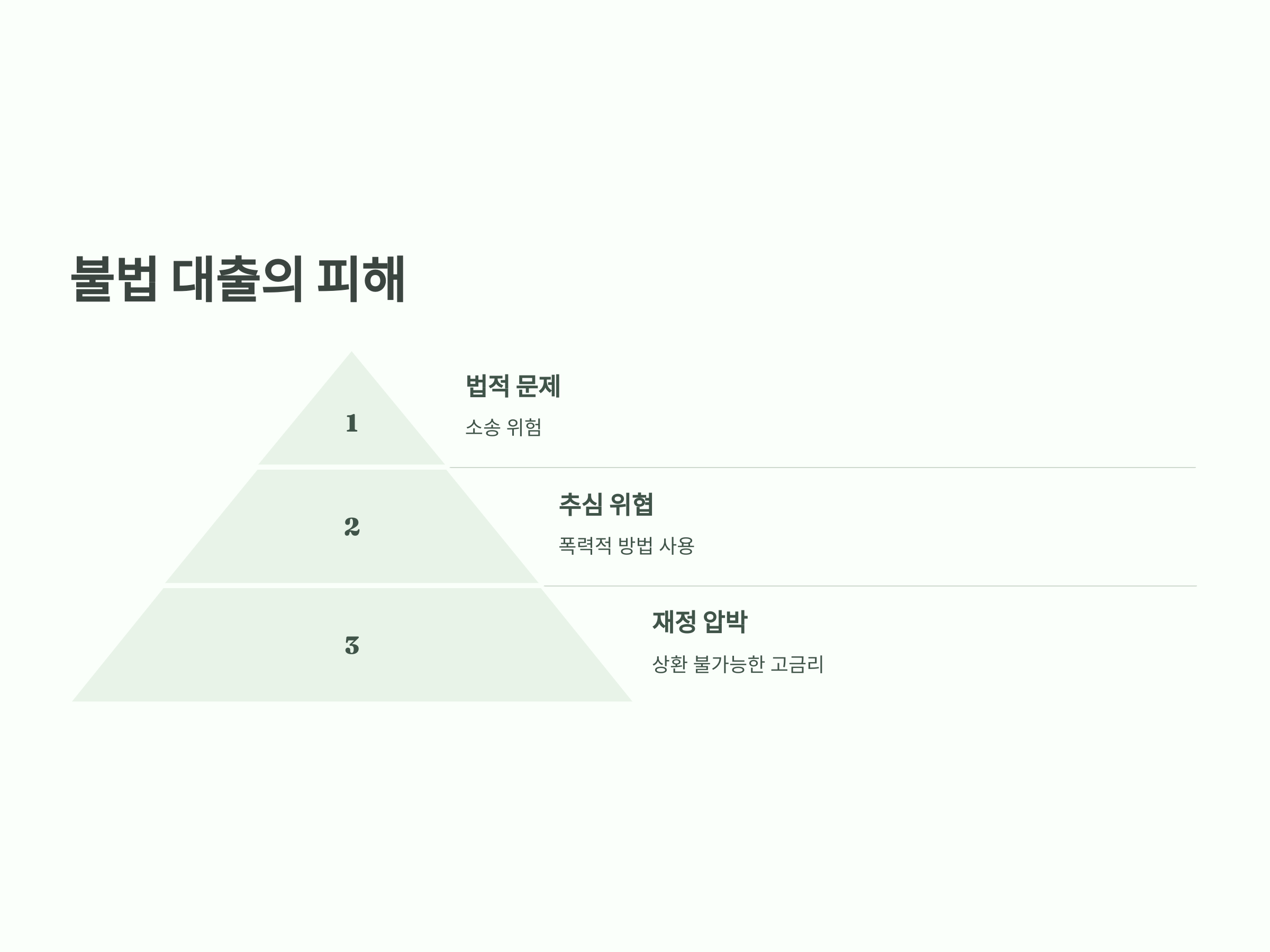 불법 대출을 받은 사람은 단지 금전적 부담뿐만 아니라 법적 문제까지 겪을 위험이 있습니다. 대출자가 갚지 못한 채무에 대해 불법 대출업체는 추심을 시도할 수 있으며, 때로는 폭력적인 방법을 사용하기도 합니다. 이러한 경우 대출자는 신체적, 정신적 피해를 입을 수 있습니다.