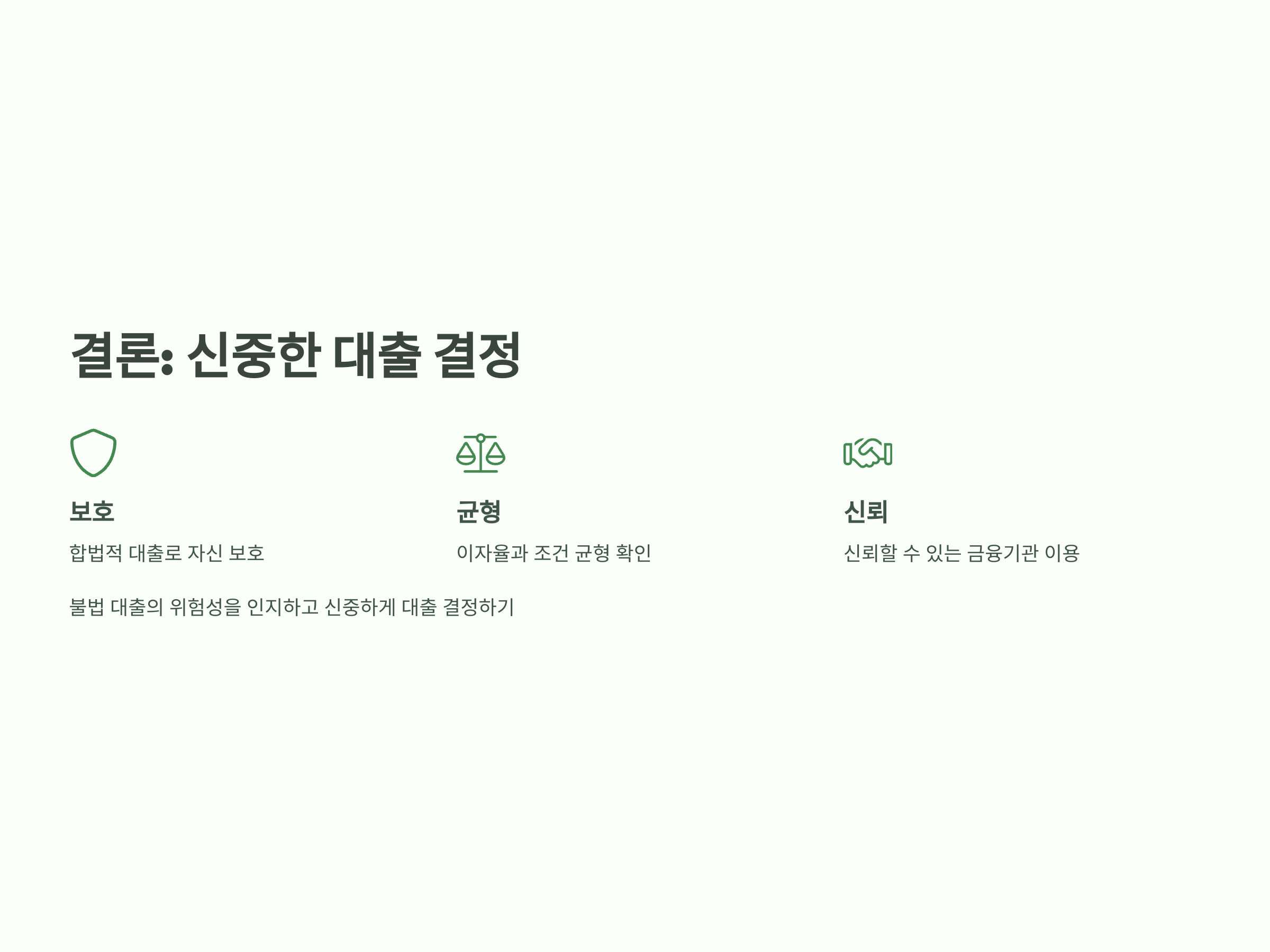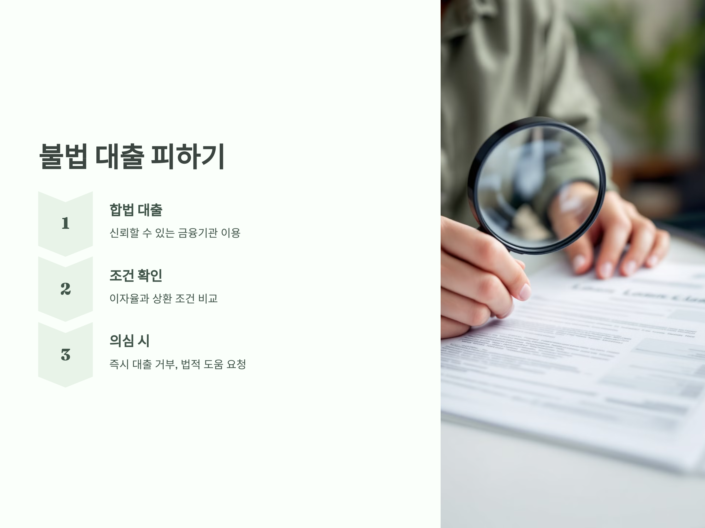 대출을 받기 전에 이자율과 상환 조건을 충분히 비교하고, 불법적인 조건이 포함되지 않았는지 확인해야 합니다. 만약, 대출 조건이 불명확하거나 지나치게 높은 금리를 제시하는 경우, 해당 대출은 불법 대출일 가능성이 높습니다. 이 경우 즉시 대출을 피하고, 법적 도움을 받을 필요가 있습니다.