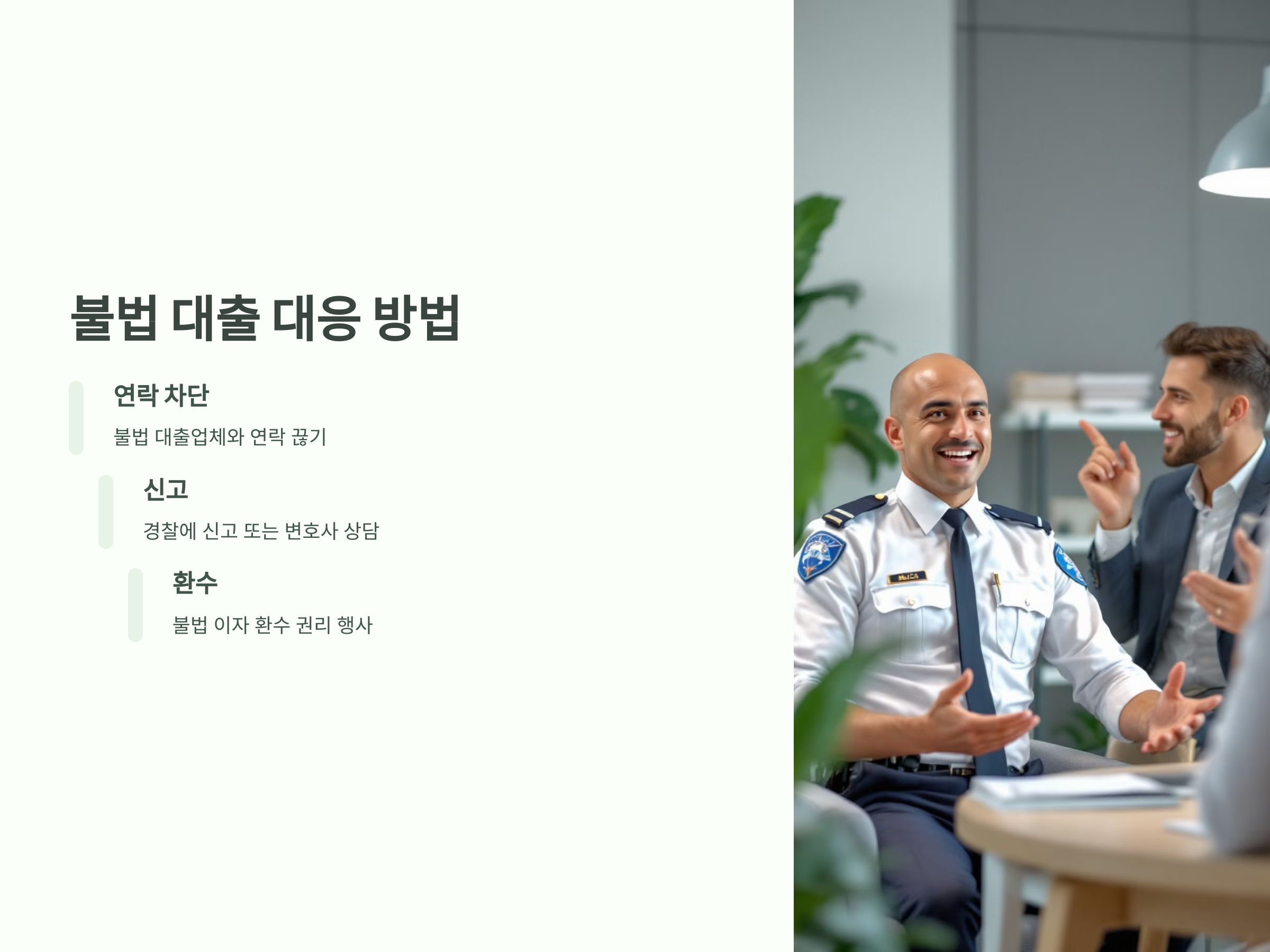 불법 대출을 받았다면, 경찰에 신고하거나, 변호사의 도움을 받아 법적 절차를 밟는 것이 중요합니다. 불법 대출업체는 불법적인 이자와 추심 방법을 사용할 수 있기 때문에, 이를 신고하여 법적 대응을 해야 합니다.