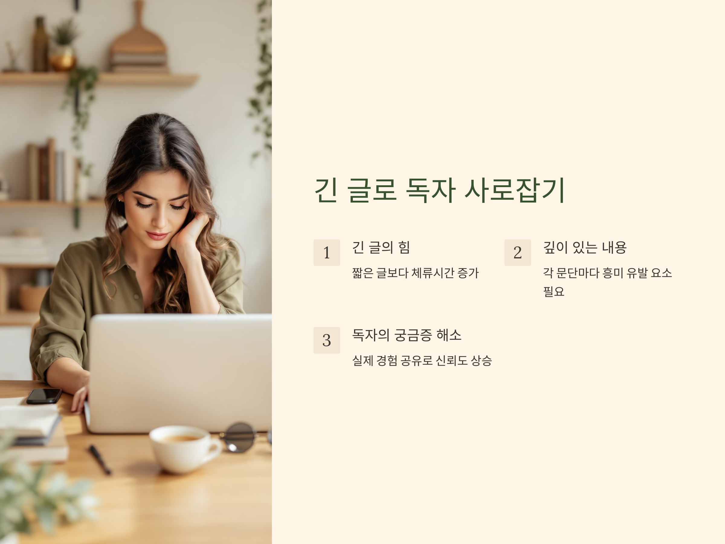 글의 길이를 늘릴 때는 독자가 궁금해할 수 있는 다양한 주제를 포함하는 것이 좋습니다. 블로그 글을 쓸 때, '독자가 실제로 궁금해할 문제'를 해결하는 방식으로 글을 풀어나가면 체류시간을 자연스럽게 늘릴 수 있습니다. 예를 들어, '이 방법을 시도했더니 이런 결과가 있었다'는 식으로 실제 경험을 공유하면 독자들이 더 오랫동안 머무르게 됩니다.