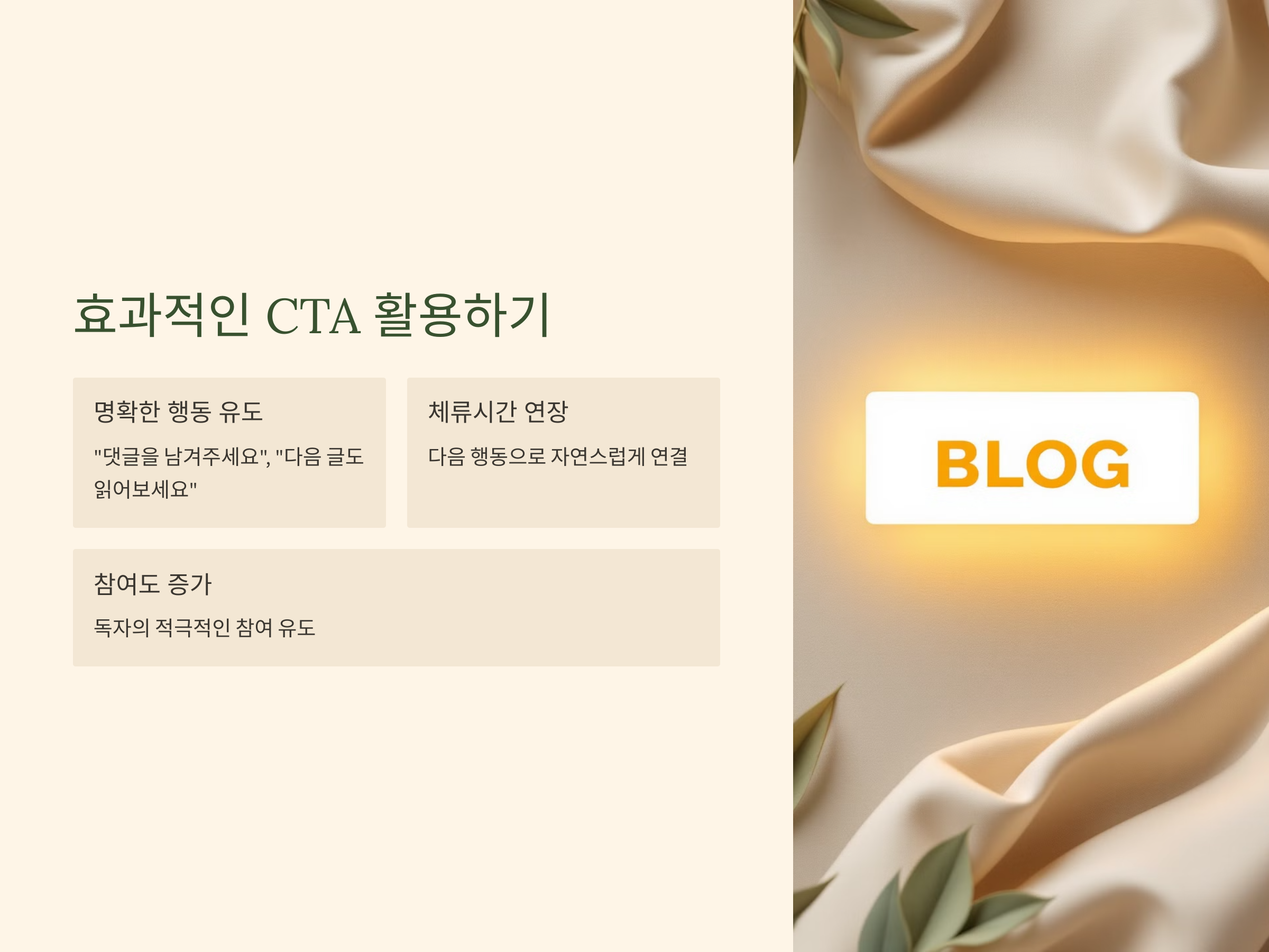 블로그 글이 끝나갈 무렵, 독자들에게 행동을 유도하는 메시지(CTA)를 넣는 것이 중요합니다. "이 글이 유용했다면 댓글을 남겨주세요", "다음 글도 읽어보세요"와 같은 호출은 방문자에게 더 많은 액션을 유도할 수 있습니다.