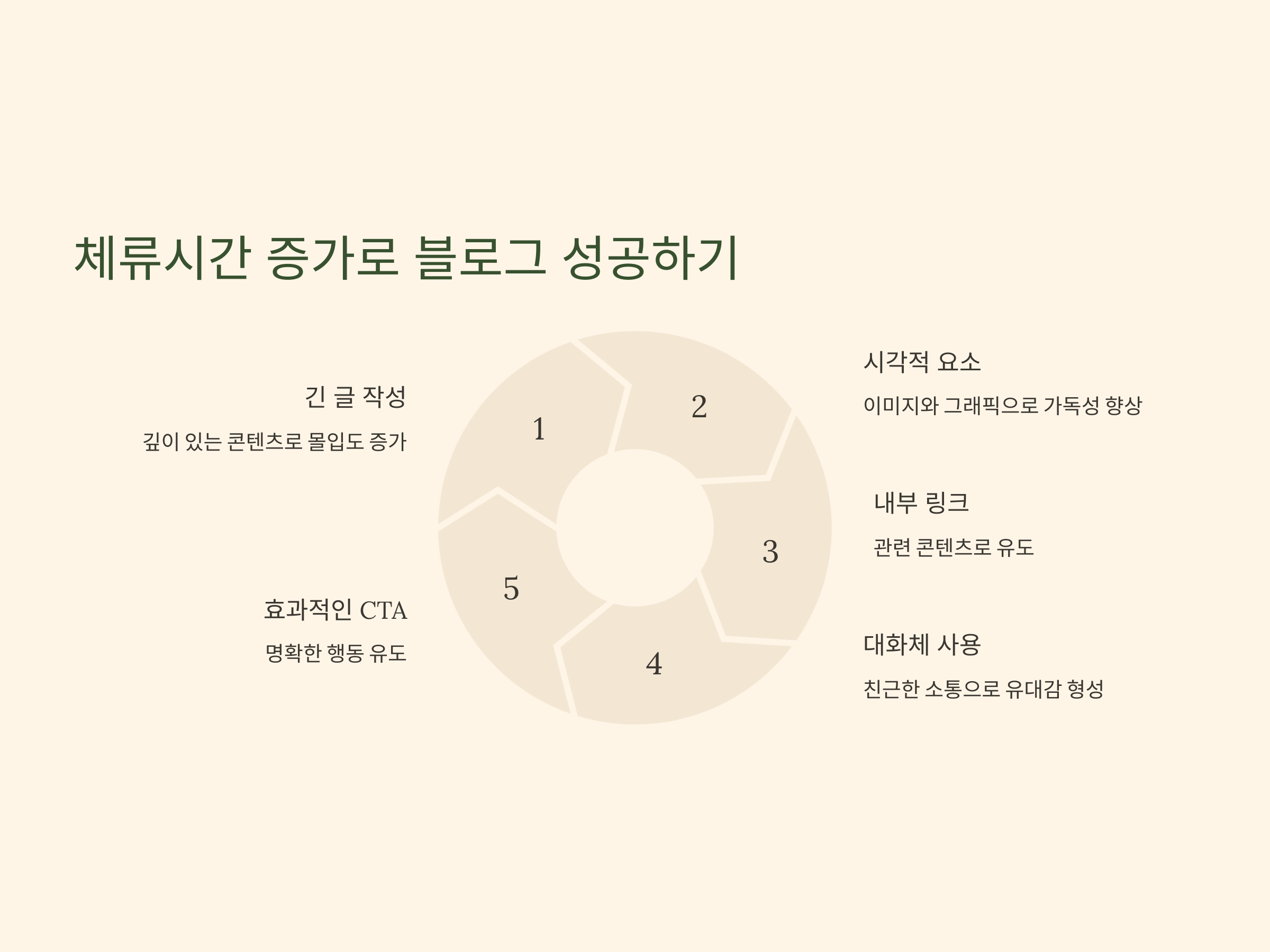 체류시간을 늘리는 방법은 다양합니다. 긴 글, 이미지, 내부 링크, 대화체, 그리고 명확한 CTA 등을 통해 독자들이 블로그에 더 오래 머물도록 유도할 수 있습니다. 중요한 점은 이러한 방법들이 자연스럽게 글에 녹아들 수 있도록 구성해야 한다는 것입니다.