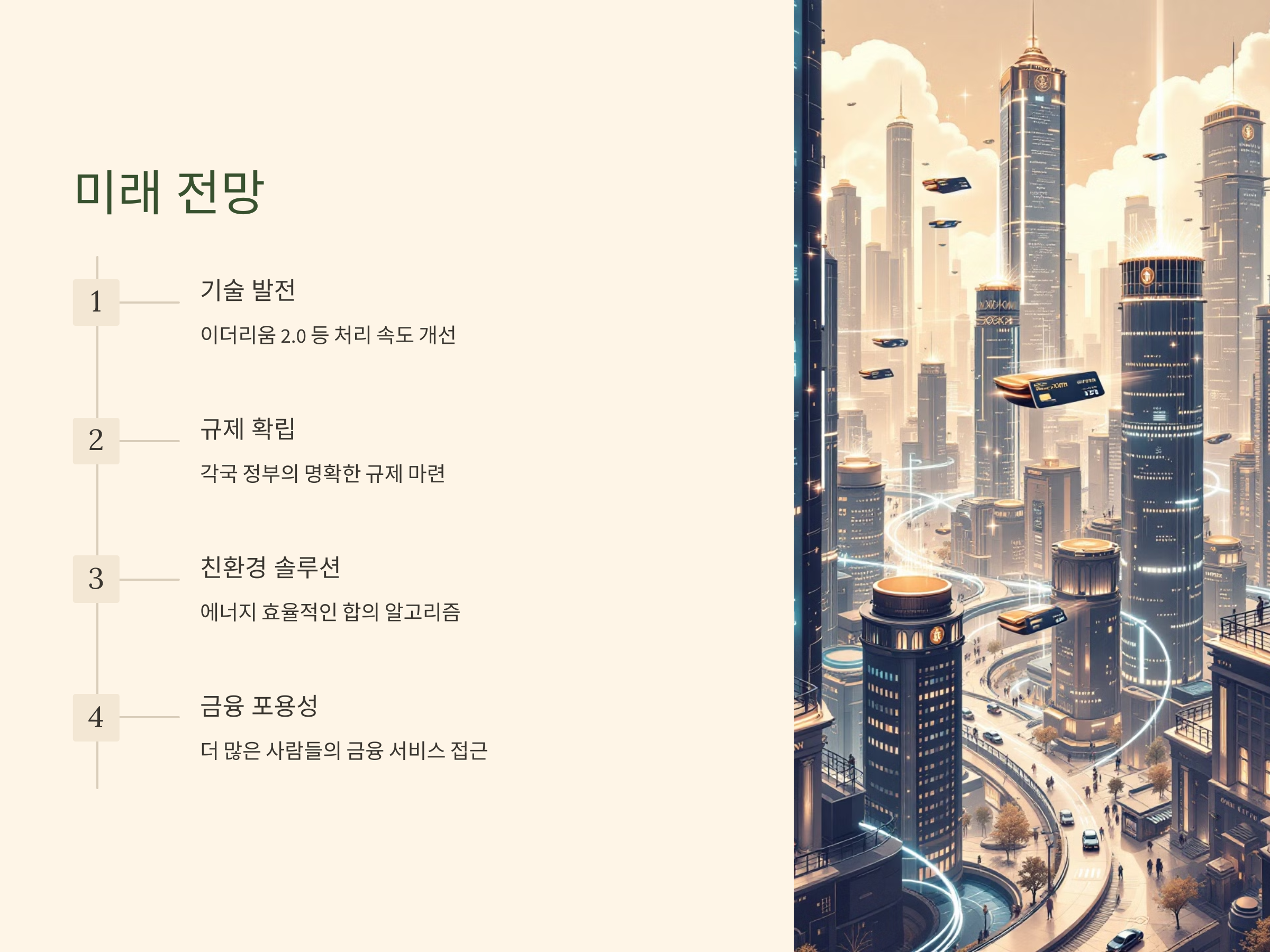 하지만, 블록체인 기술이 상용화되기 위해서는 해결해야 할 문제들이 여전히 존재합니다. 규제 문제, 확장성 문제, 에너지 소비 문제 등을 해결하는 데 필요한 연구와 개발이 계속 이루어져야 합니다. 그럼에도 불구하고, 블록체인 기술이 금융 산업을 변화시키는 잠재력은 매우 크며, 앞으로의 발전에 대한 기대감은 매우 큽니다. 이제 우리는 블록체인 기술을 통해 더욱 안전하고 효율적인 금융 서비스를 누릴 수 있는 시대에 접어들고 있습니다.