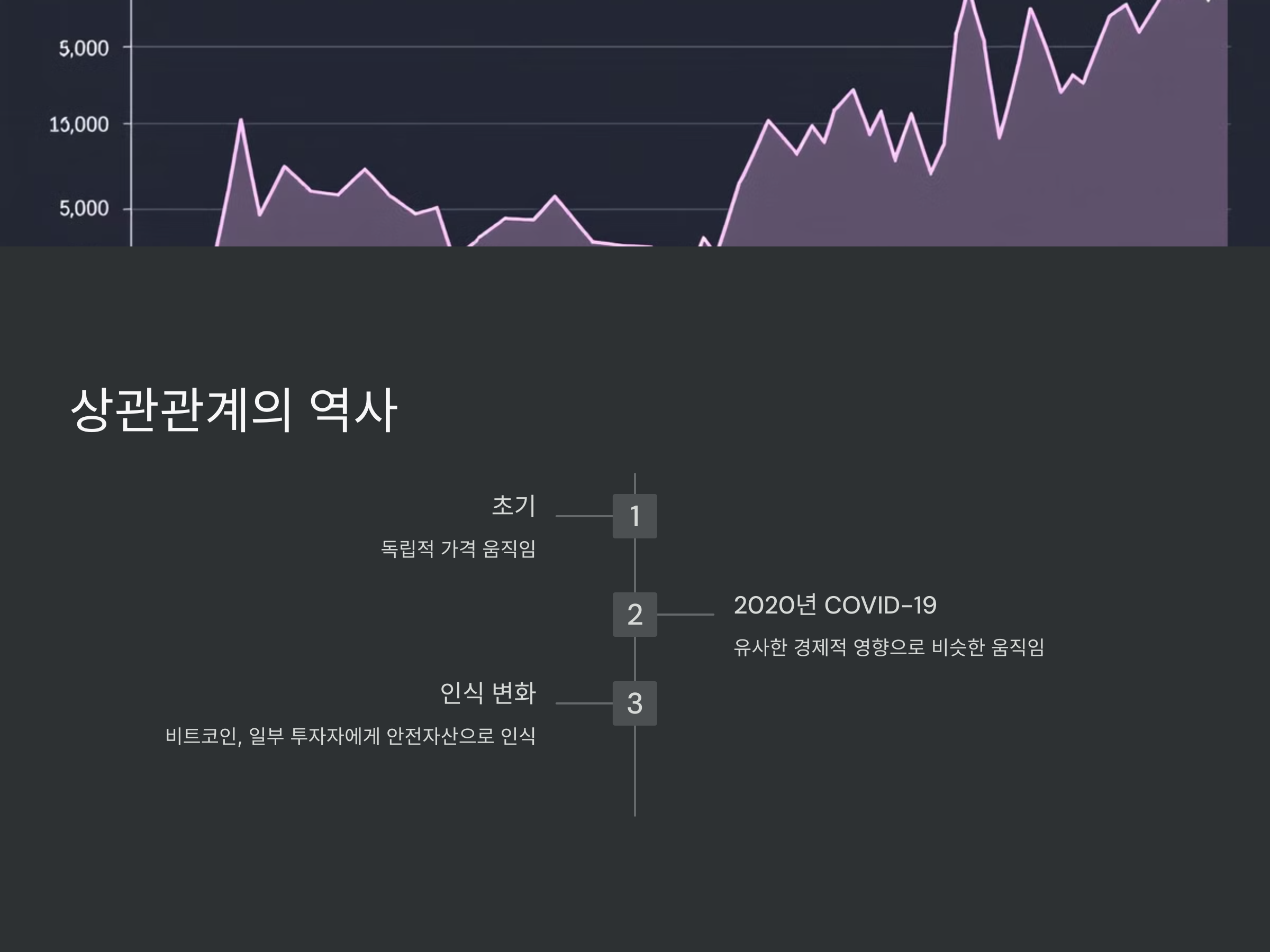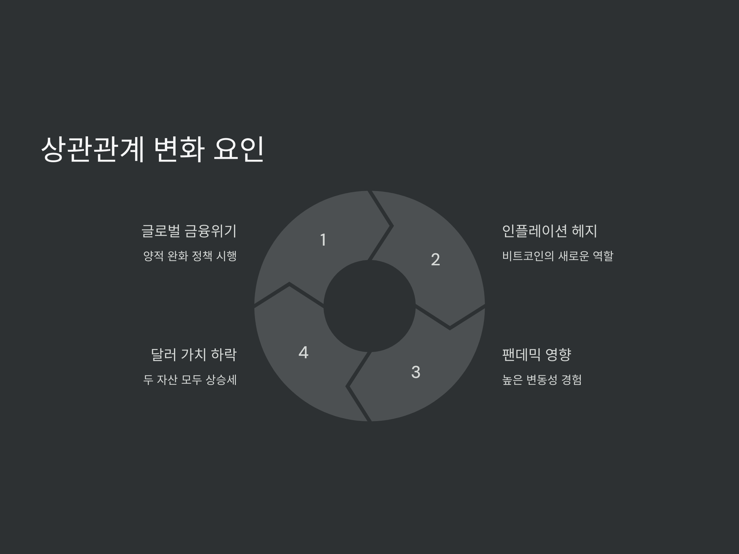 2008년 글로벌 금융위기 이후, 전 세계의 중앙은행들은 양적 완화 정책을 시행하고, 이는 전통적인 주식 시장과 암호화폐 시장에 영향을 미쳤습니다. 특히, 비트코인의 경우 인플레이션 헤지 수단으로서의 가능성을 제시하기 시작했습니다. 이로 인해, 비트코인과 S&P500의 상관관계가 다소 증가하게 되었습니다.