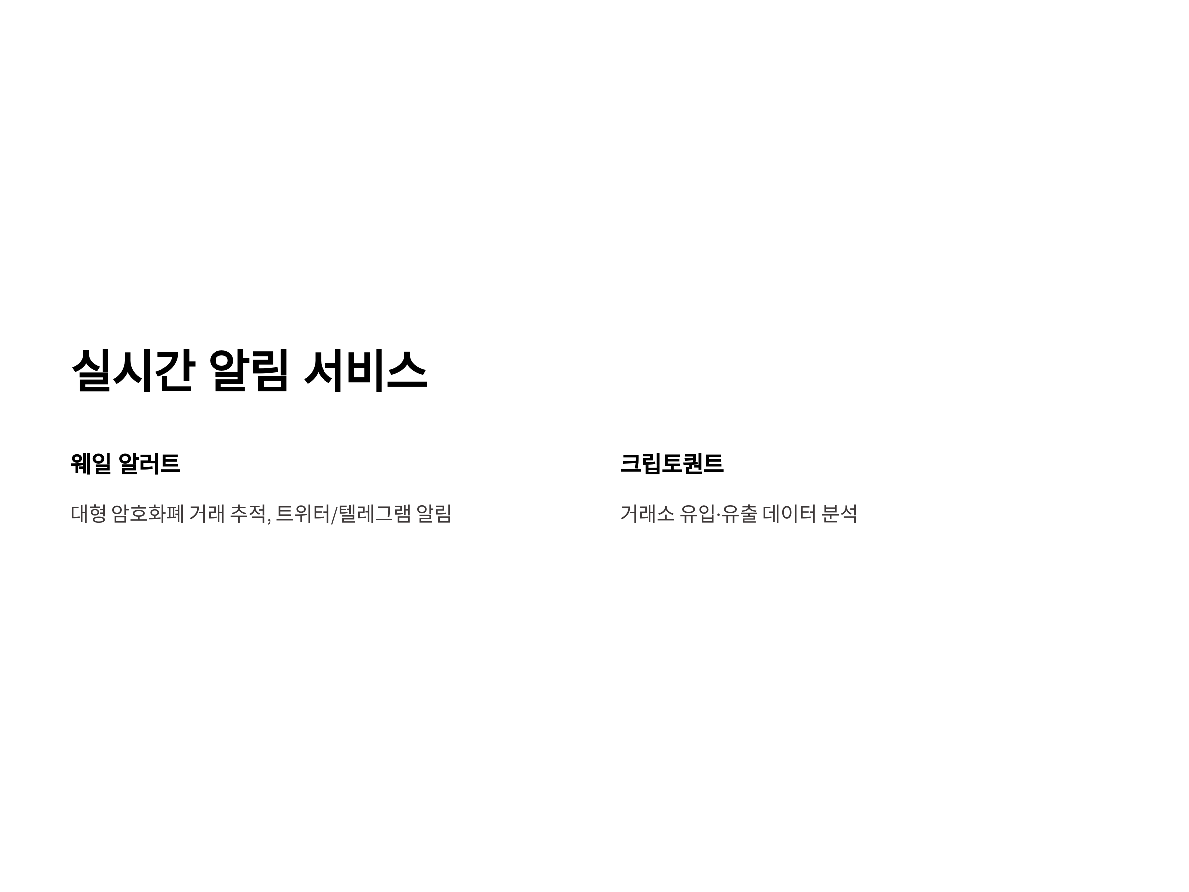 - 웨일 알러트(Whale Alert): 대형 암호화폐 거래를 추적해 트위터와 텔레그램으로 알림 제공