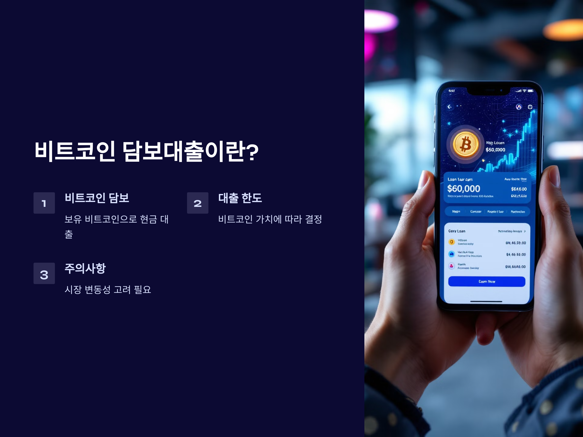 비트코인 담보대출 서비스는 말 그대로 비트코인을 담보로 자금을 대출받는 서비스입니다. 기존의 대출 상품들과는 달리, 비트코인을 보유하고 있는 사람은 이를 담보로 제공하고, 필요한 금액을 현금으로 대출받을 수 있습니다. 이 방식은 특히 비트코인과 같은 디지털 자산을 자주 거래하거나 보유하는 사람들에게 유용합니다.