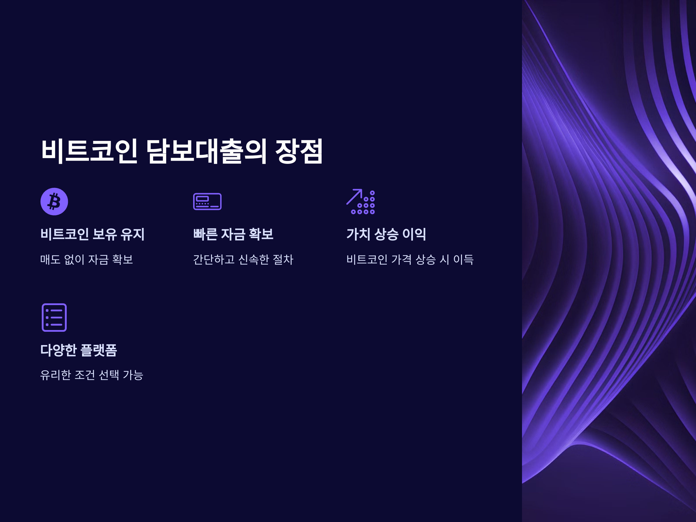 - 비트코인 보유 유지: 가장 큰 장점은 비트코인을 팔지 않고도 자금을 확보할 수 있다는 점입니다. 많은 비트코인 투자자들이 자산을 매도하는 대신, 필요한 자금을 대출받아 투자 자산을 계속 보유할 수 있습니다.
