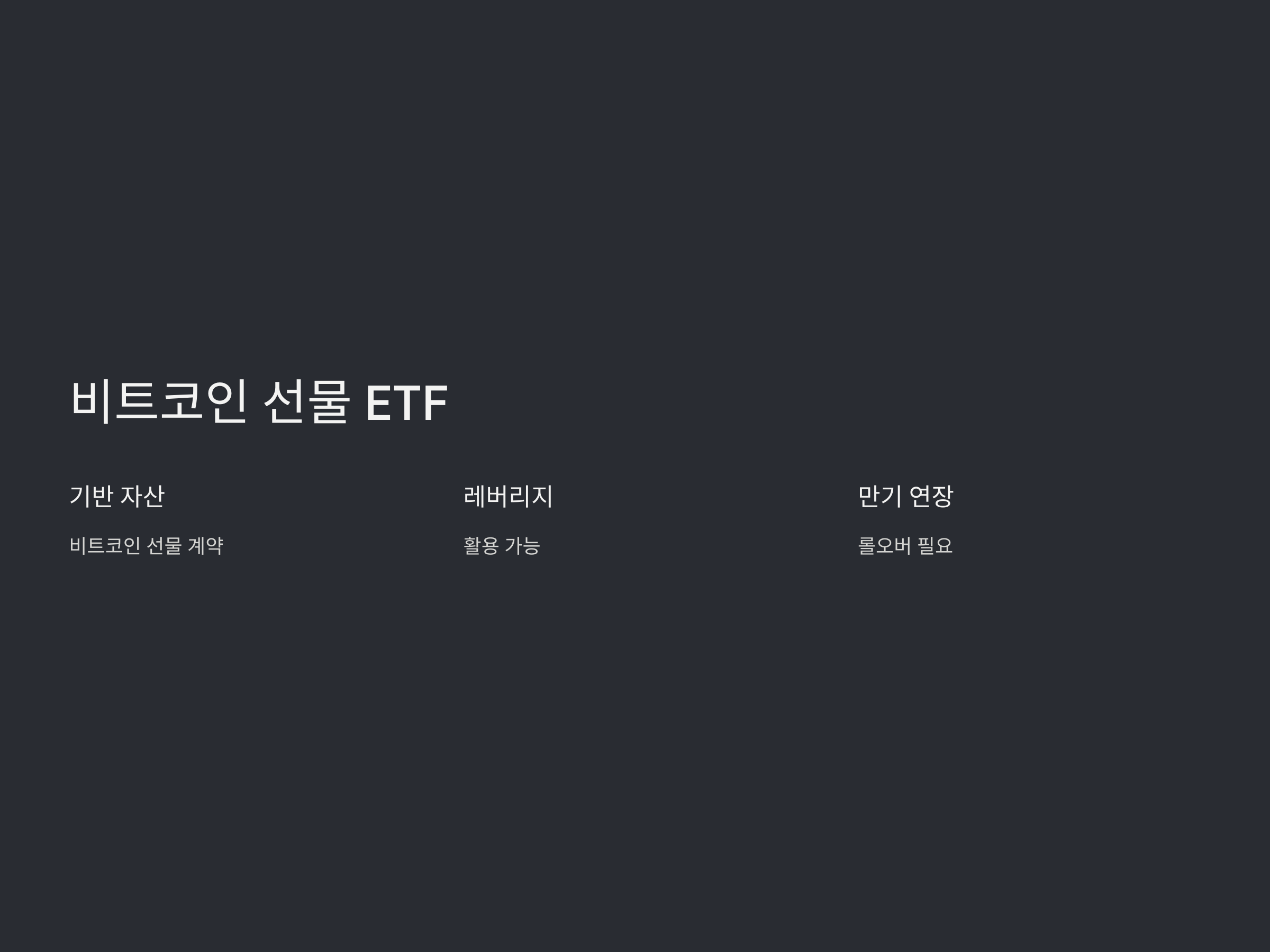 - 비트코인을 직접 보유하지 않음: 선물 계약을 통해 가격 변동을 추종합니다.