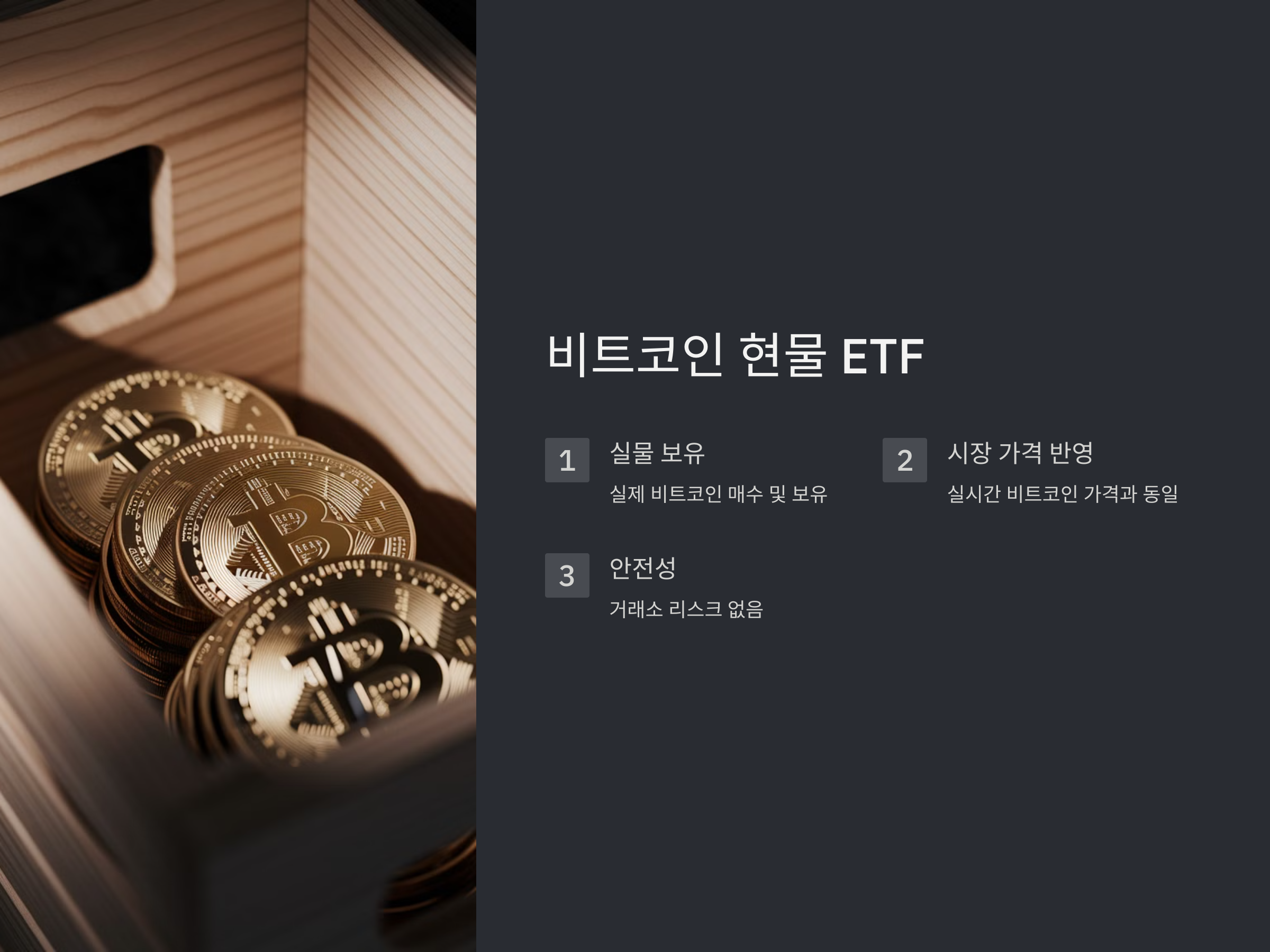 비트코인 현물 ETF는 실제 비트코인을 매수하여 보유하는 ETF입니다. 즉, 펀드가 비트코인을 직접 보유하고, ETF를 통해 투자자는 비트코인 가격 변동에 직접적으로 노출됩니다.