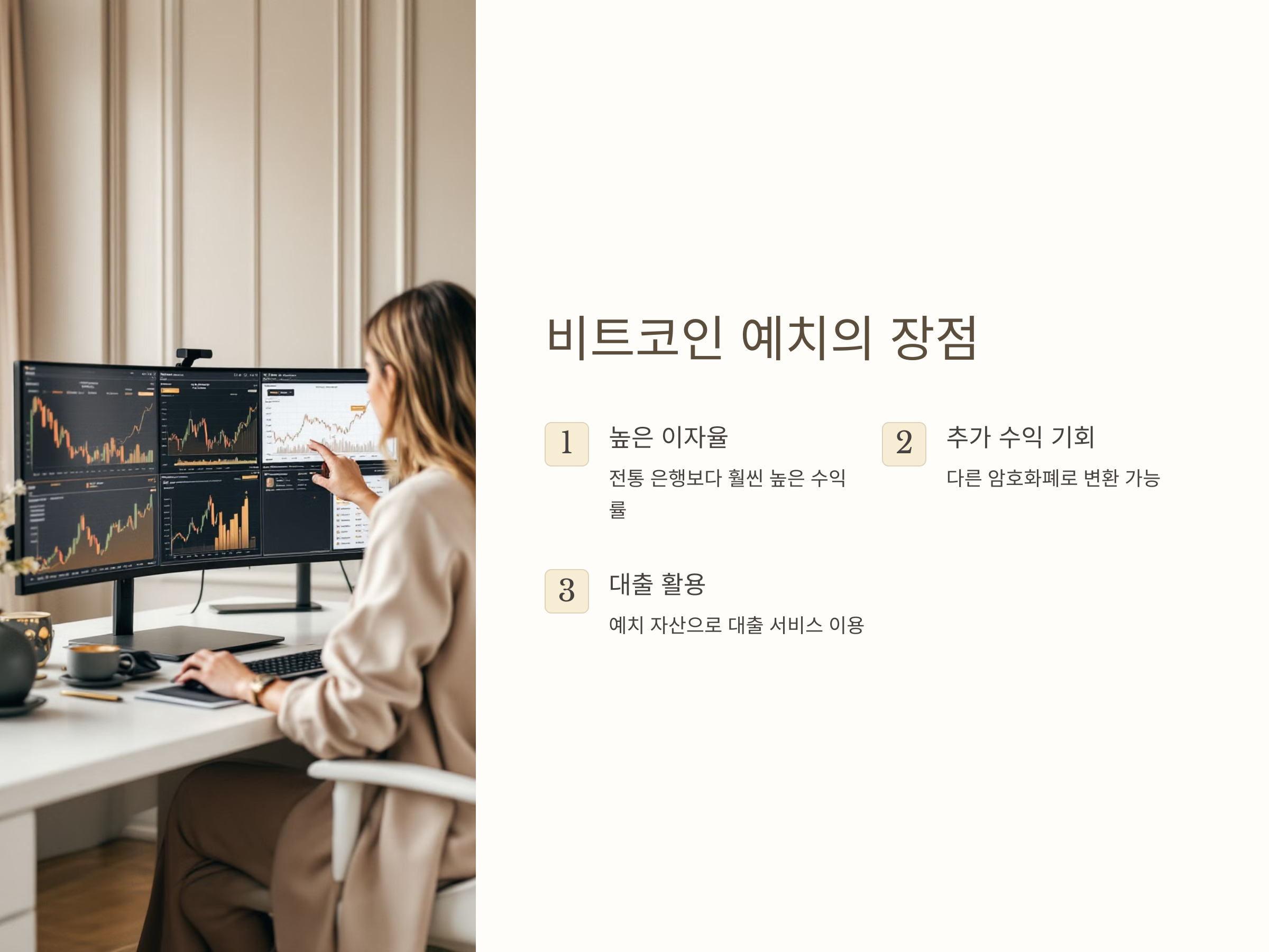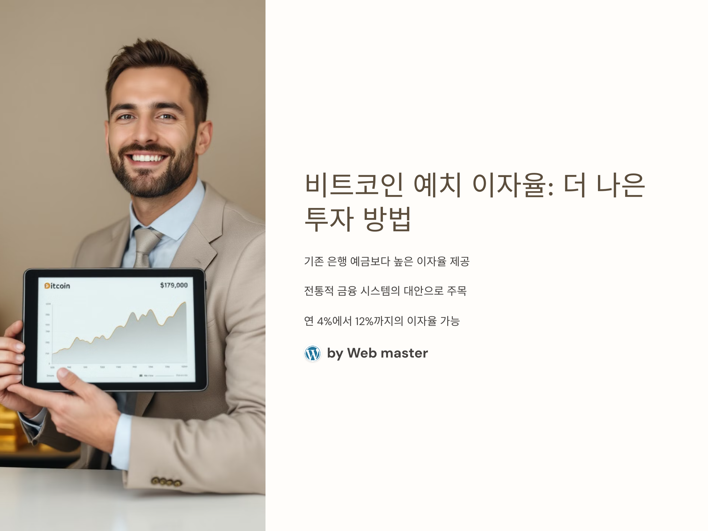 비트코인 예치의 가장 큰 장점 중 하나는 기존의 금융 서비스보다 훨씬 높은 이자율을 제공한다는 점입니다. 예를 들어, 전통적인 은행 예금에서는 몇 퍼센트의 이자율도 얻기 어려운 반면, 암호화폐 플랫폼에서는 연 5% 이상의 이자율을 제공하는 곳이 많습니다. 이는 비트코인과 같은 암호화폐의 특성상 더 높은 이익을 추구하는 경향이 있기 때문입니다.