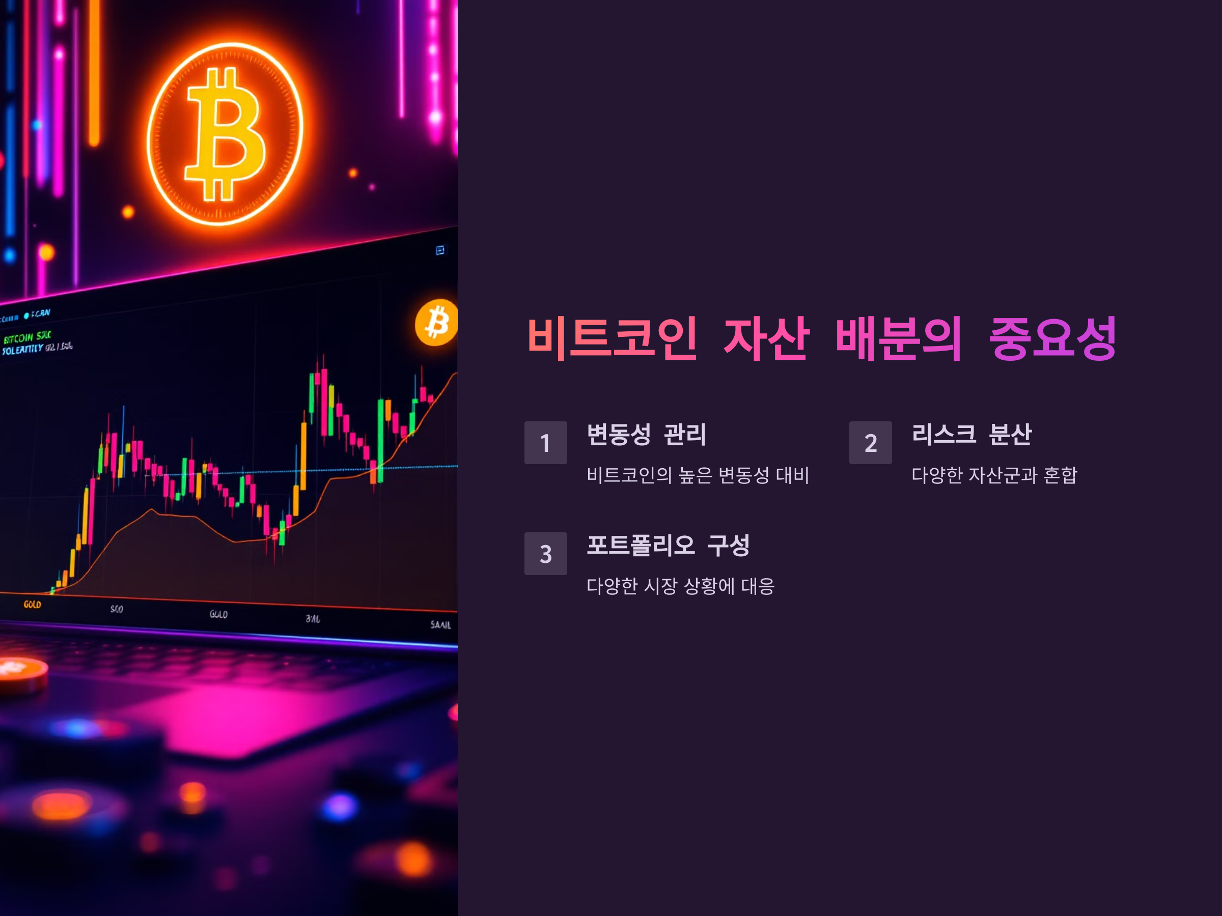 비트코인 자산 배분에서 가장 중요한 점은 변동성을 관리하는 것입니다. 비트코인은 기존 자산군과는 다른 특성을 지니고 있기 때문에 이를 다른 자산과 혼합하여 리스크를 최소화하는 전략이 필요합니다. 일반적으로 주식, 채권, 금 등 다양한 자산군에 비트코인을 추가함으로써 리스크를 분산하고, 다양한 시장 상황에 대응할 수 있는 포트폴리오를 구성하는 것이 중요합니다.