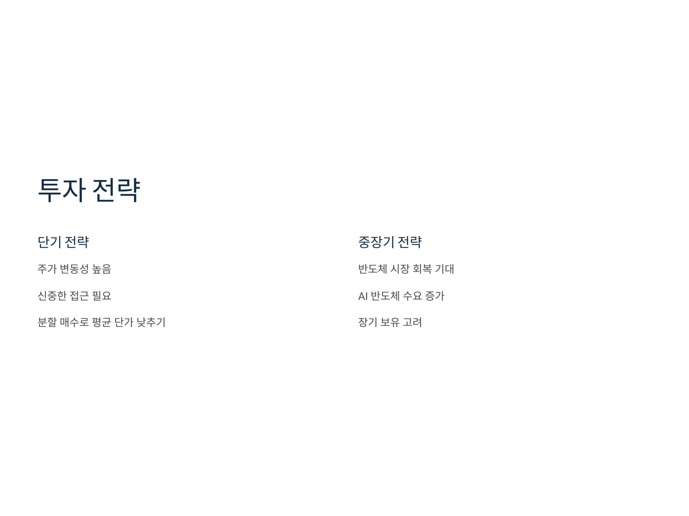 중장기적으로는 반도체 시장의 회복과 AI 반도체 수요 증가에 따른 수익성 개선이 예상되므로, 장기 보유를 고려할 수 있습니다. 특히, 배당 수익률을 활용한 재투자 전략도 유효합니다.