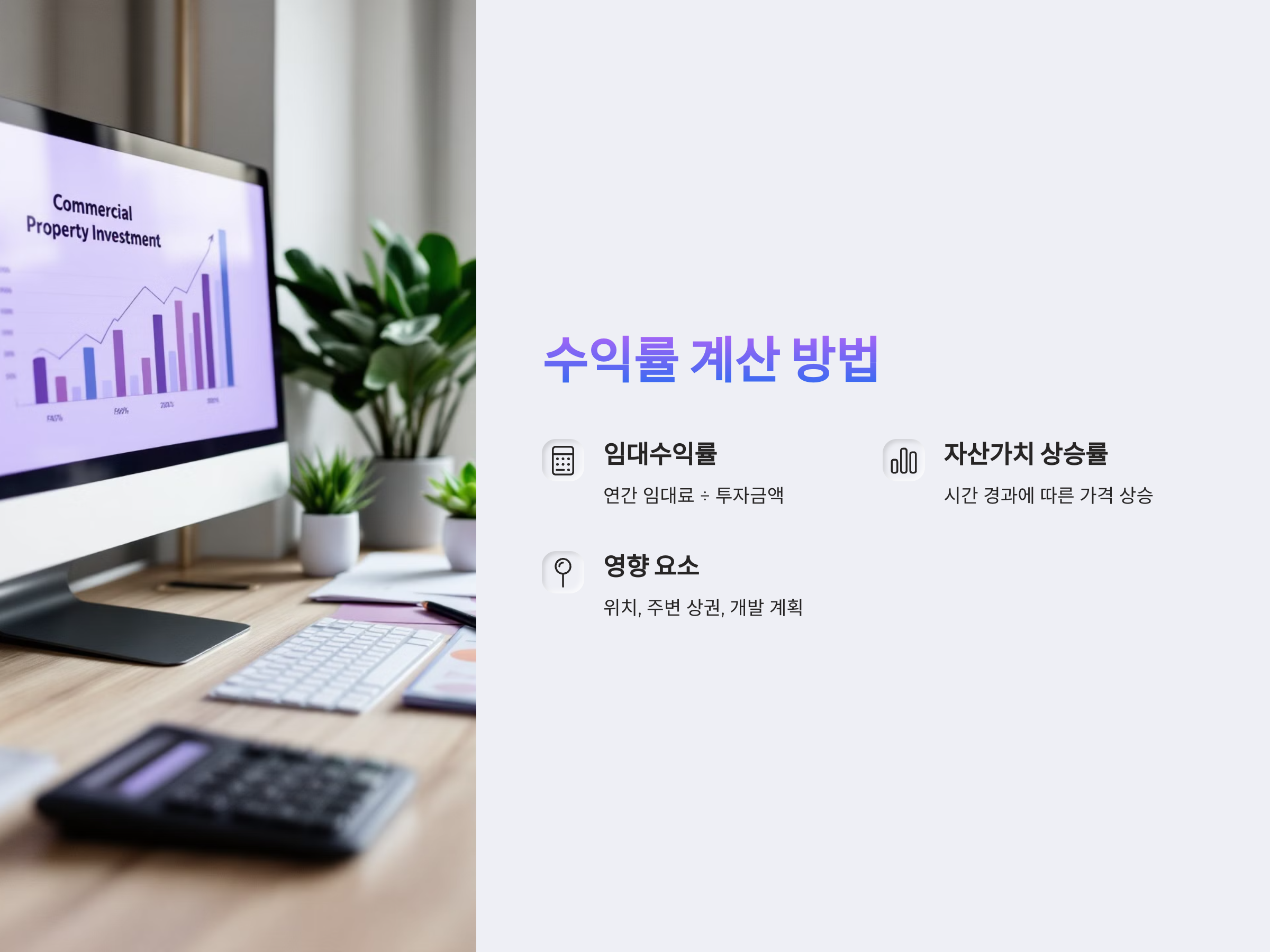 상가 투자의 수익률을 계산하는 방법은 여러 가지가 있습니다. 그 중 가장 기본적인 방법은 임대수익률과 자산가치 상승률을 고려한 계산법입니다. 임대수익률은 상가의 월세나 연세를 투자금액으로 나누어 구하는 방식으로, 단순히 임대료 수입을 기반으로 계산됩니다. 예를 들어, 1억원에 상가를 구입하고 월세가 100만원이라면, 연간 임대수익률은 12%가 됩니다.