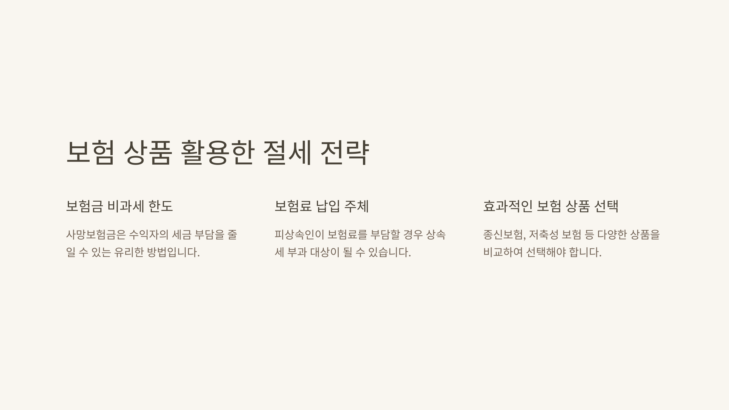 보험 상품은 상속세 절세의 대표적인 방법 중 하나입니다. 특히 저축성 보험을 이용하면 사망 시 수익자가 받는 보험금의 일부가 비과세 처리가 되어 상속세 부담을 줄일 수 있습니다.