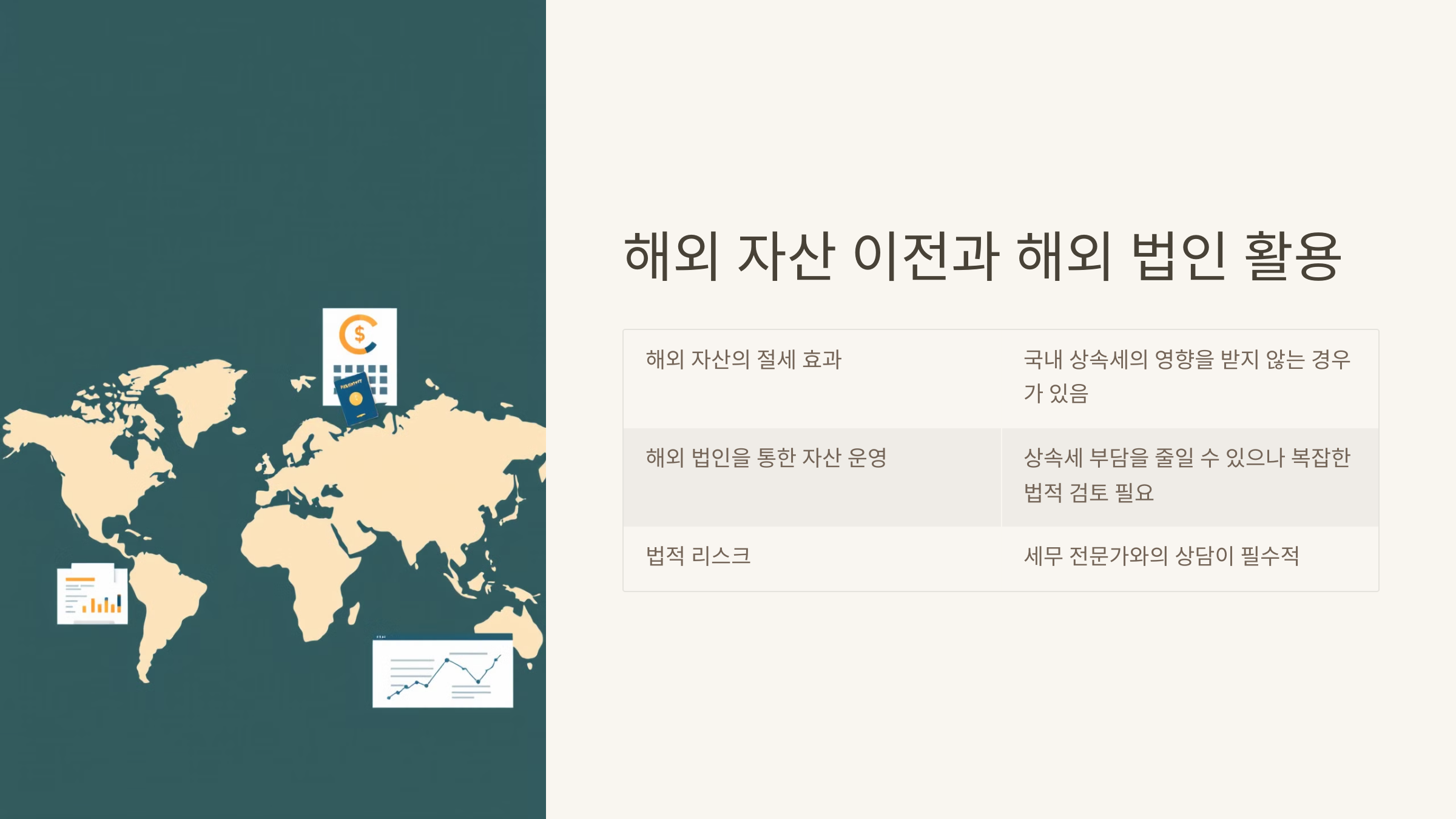 해외에 자산을 이전하거나 해외 법인을 활용하는 방법도 상속세 절세에 활용됩니다. 다만, 법적인 복잡성과 리스크가 크므로 신중하게 접근해야 합니다.