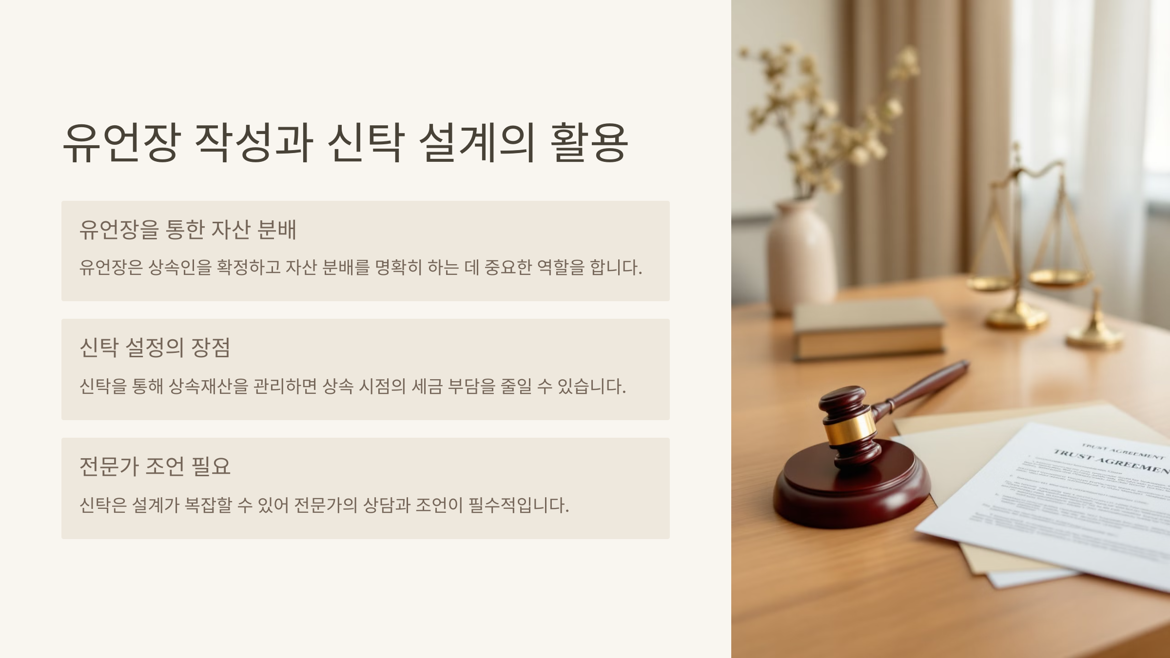 유언장을 작성하여 상속 계획을 명확히 하고, 신탁을 통해 자산을 분배하는 방식은 상속세를 줄이는 또 다른 방법입니다. 신탁을 통해 상속세를 유예하거나, 상속인의 세금 부담을 줄일 수 있는 효과가 있습니다.