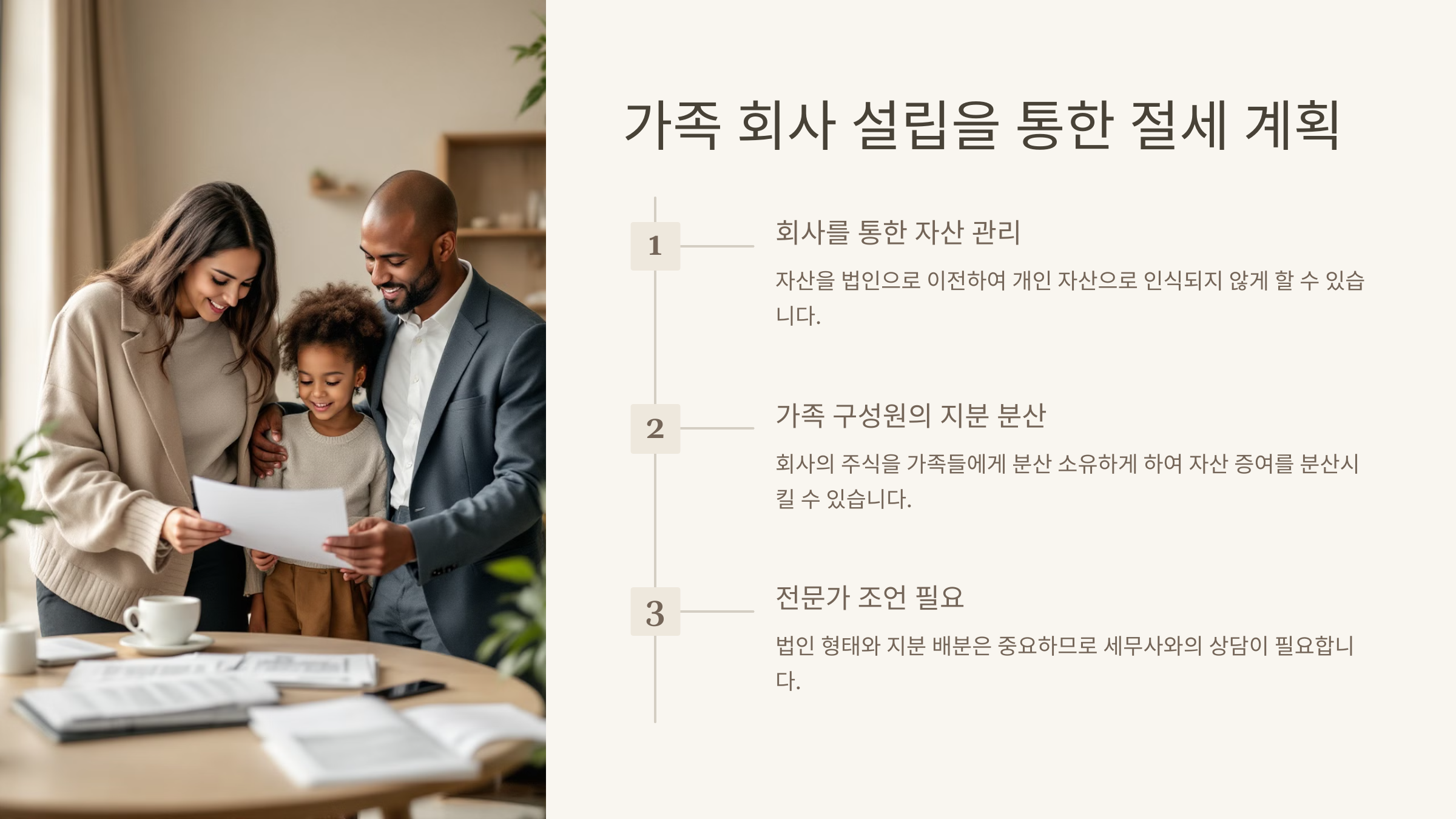 - 주의사항: 법인의 형태와 가족 구성원의 지분 배분은 매우 중요한 요소이므로 전문가의 조언을 받는 것이 좋습니다. 자칫 잘못 설계하면 예상치 못한 세금을 낼 수 있으므로 세무사와의 상담을 추천합니다.