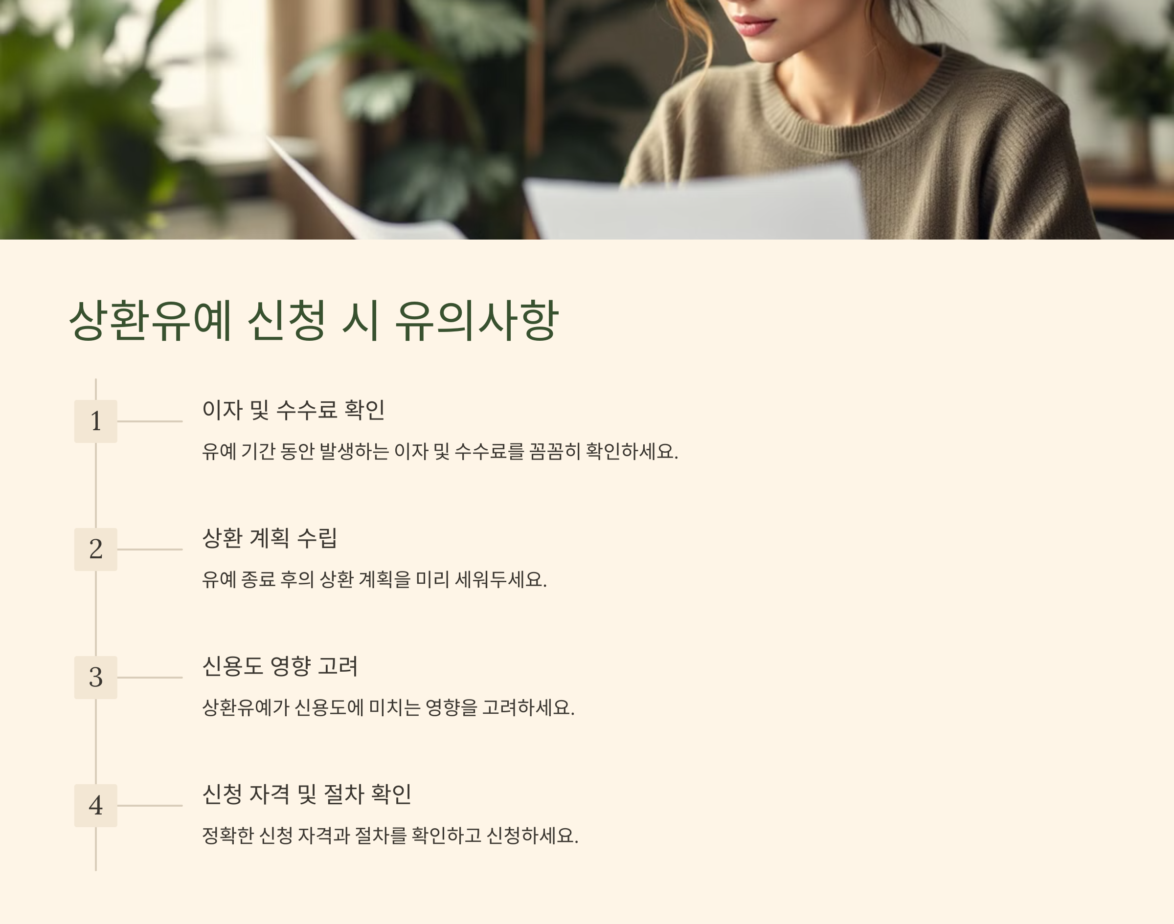상환유예 제도를 활용하면 일시적인 재정적 어려움을 해소할 수 있지만, 유예 기간 동안의 이자 발생 및 상환 기간 연장으로 인해 총 상환 금액이 증가할 수 있습니다. 따라서 유예 종료 후의 상환 계획을 철저히 수립하고, 신용도에 미치는 영향을 고려하여 신중하게 결정해야 합니다.