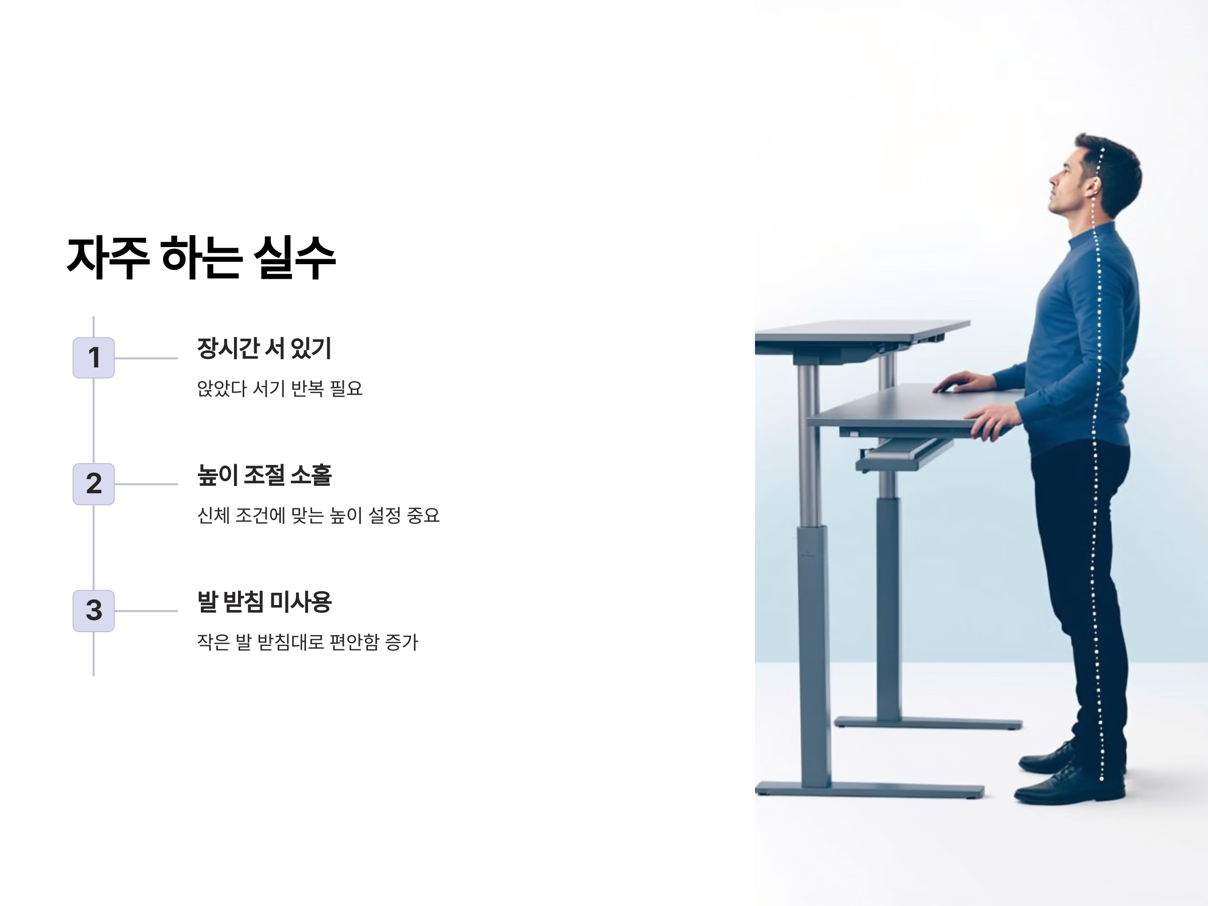 많은 사람들이 서서 일하기 책상을 사용하는 중 몇 가지 실수를 저지르곤 합니다. 이러한 실수를 피해야만 최적의 효과를 얻을 수 있습니다.