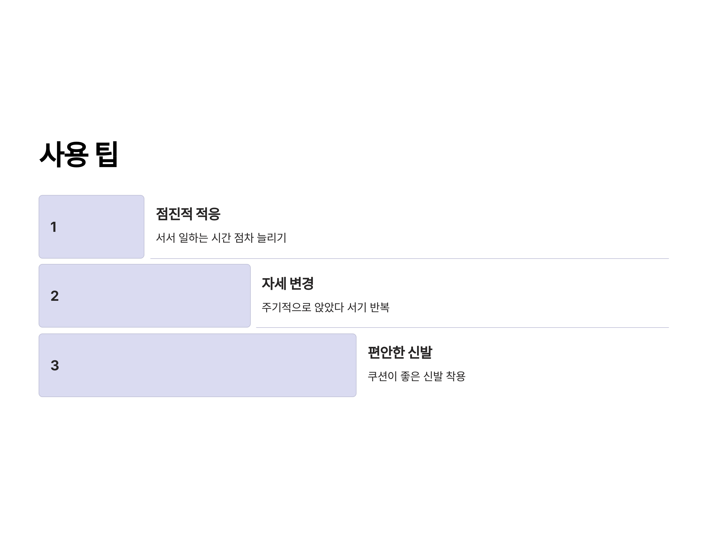 - 발 받침 사용: 장시간 서 있을 때는 한쪽 발을 받침대에 올려 허리의 부담을 줄이는 것이 좋습니다.