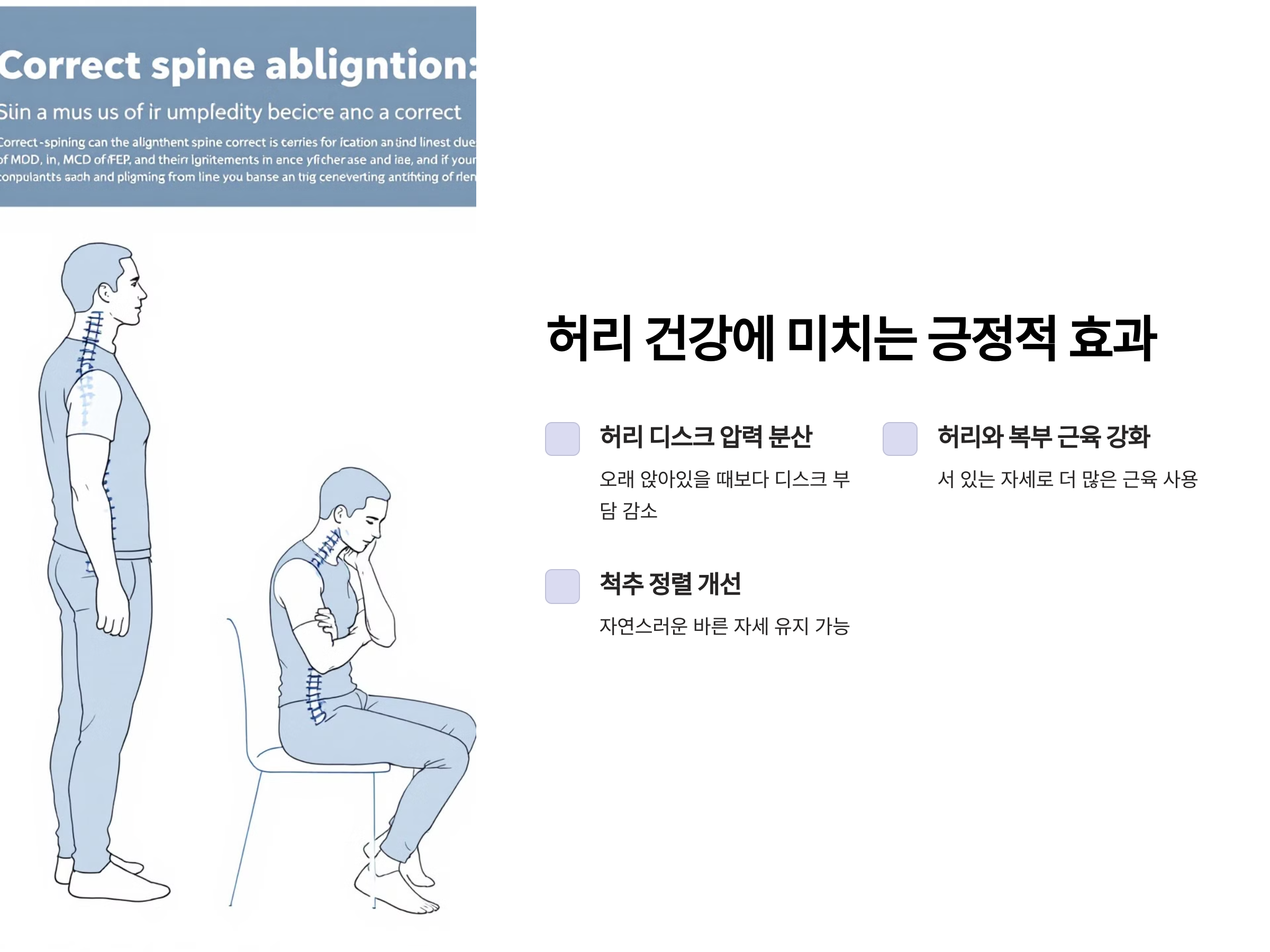 - 자세 개선: 앉아 있을 때보다 자연스럽게 바른 자세를 유지할 수 있어 척추의 정렬이 더 좋아집니다.