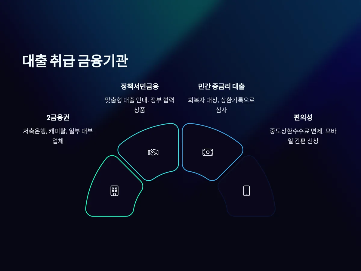 성실상환자 대출을 취급하는 곳은 주로 2금융권, 즉 저축은행이나 캐피탈, 일부 대부업체들입니다. 특히 ‘정책서민금융’을 중심으로 한 금융플랫폼에서는 성실상환자에게도 맞춤형 대출을 안내하고 있으며, 정부와 협력해 진행되는 상품도 늘고 있습니다.