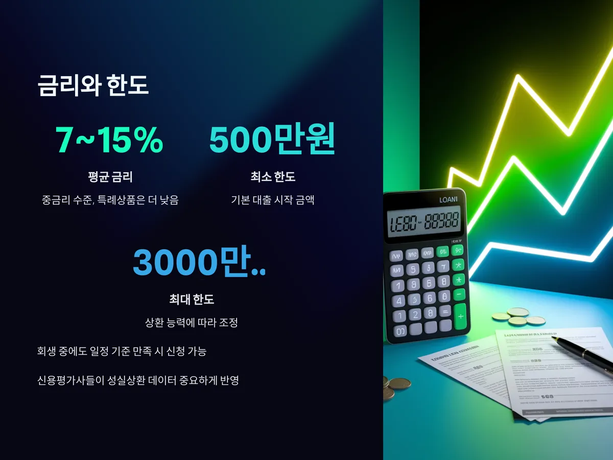 대출 금리는 금융사별로 다르며, 성실상환 여부 외에도 현재 신용점수, 소득, 기존 부채 수준에 따라 달라집니다. 평균적으로 연 7%~15% 사이의 중금리 수준이며, 일부 성실상환자 특례상품은 이보다 낮은 금리도 적용됩니다. 대출 한도는 보통 500만 원에서 3000만 원까지이며, 상환 능력에 따라 조정됩니다.
