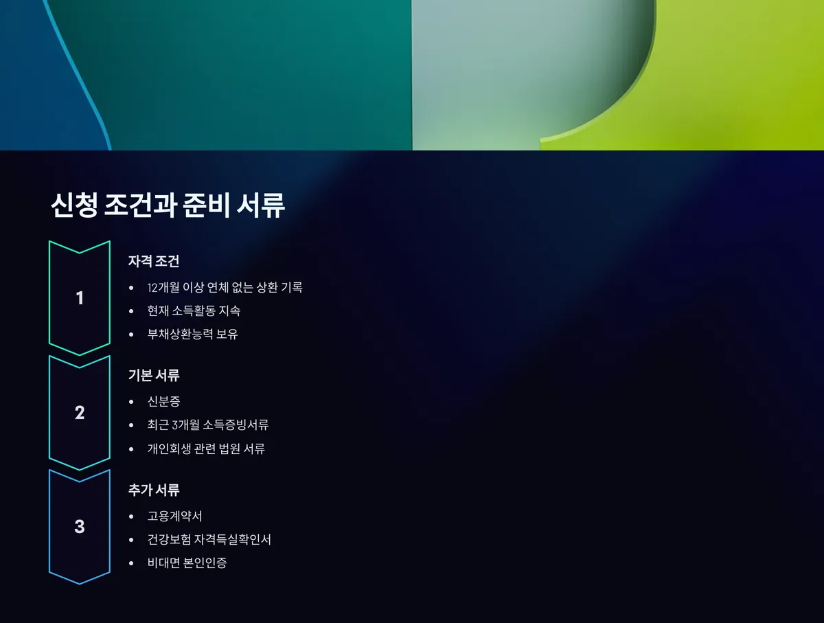 준비 서류로는 신분증, 최근 3개월 소득증빙서류(급여명세서, 거래내역서 등), 개인회생 관련 법원 결정문과 변제계획 인가문 등이 필요합니다. 일부 금융사는 추가로 고용계약서나 건강보험 자격득실확인서 등을 요구할 수 있으며, 모바일 신청 시에는 비대면 본인인증 절차가 필수입니다.