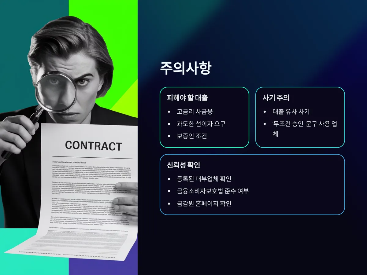 성실상환자라 하더라도 모든 대출이 안전한 것은 아닙니다. 고금리 사금융, 과도한 선이자 요구, 보증인 조건 등은 반드시 피해야 합니다. 또한, 대출 유사 사기에도 주의해야 하며, ‘무조건 승인’이라는 문구를 사용하는 업체는 신뢰성이 떨어집니다.