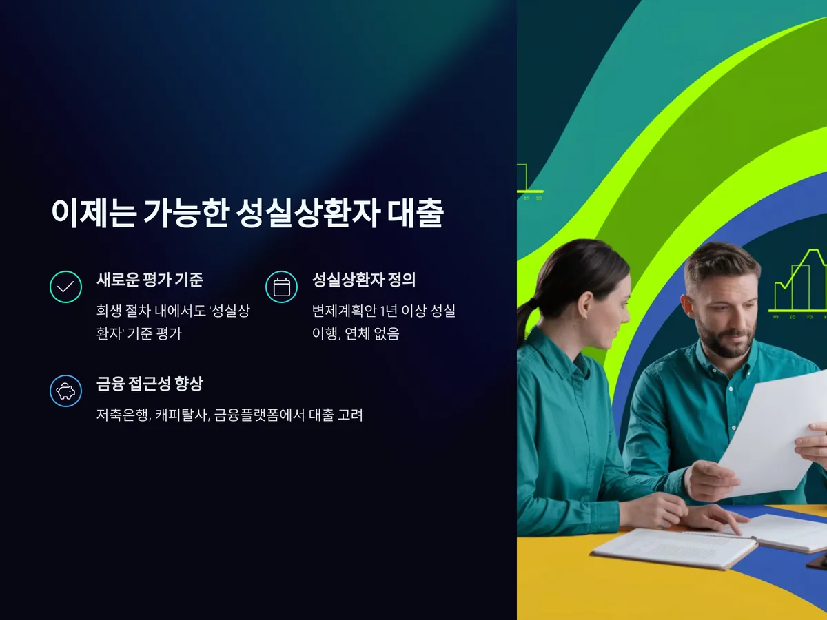 개인회생을 마무리해가는 성실상환자들에게 최근 금융권에서 긍정적인 움직임이 나타나고 있습니다. 특히 2024년 말부터 정부 정책과 금융감독원의 가이드라인 변화로 인해 성실하게 상환 중이거나 상환 완료한 개인회생자에게도 신용 회복 기회를 제공하는 정책성 금융 상품과 민간 대출이 잇따라 등장하고 있습니다. 대출 조건은 이전보다 확실히 나아졌으며, 금리나 한도에서도 혜택을 볼 수 있습니다. 특히 금융이력 부족자를 위한 '대안신용평가' 적용이 확대되며, 성실상환 기록 자체가 큰 자산으로 인정받는 분위기입니다. 이 글에서는 성실상환자 대출이 가능한 이유부터, 실제 조건과 준비 서류, 신청 시 유의할 점까지 자세히 알려드립니다.