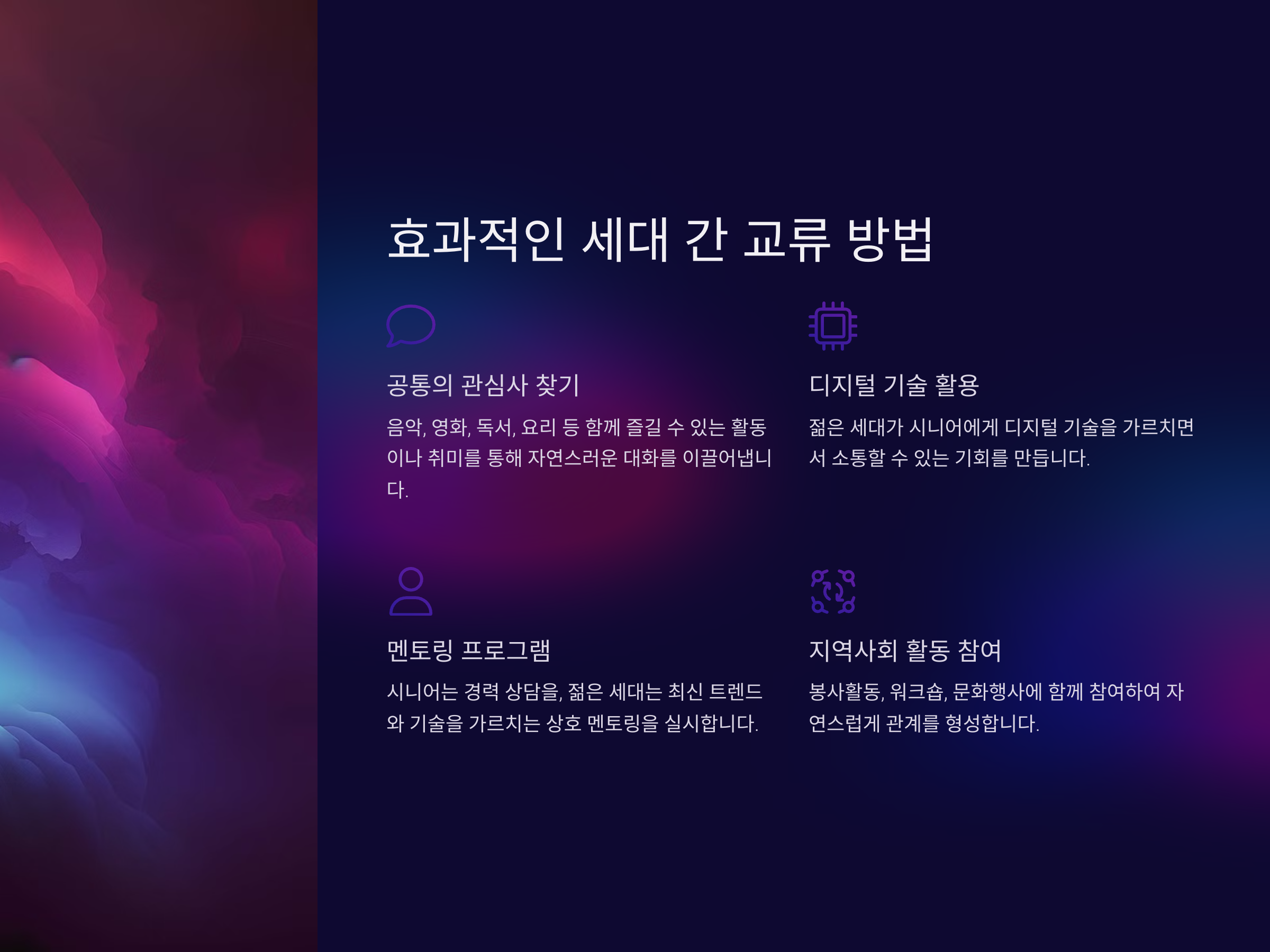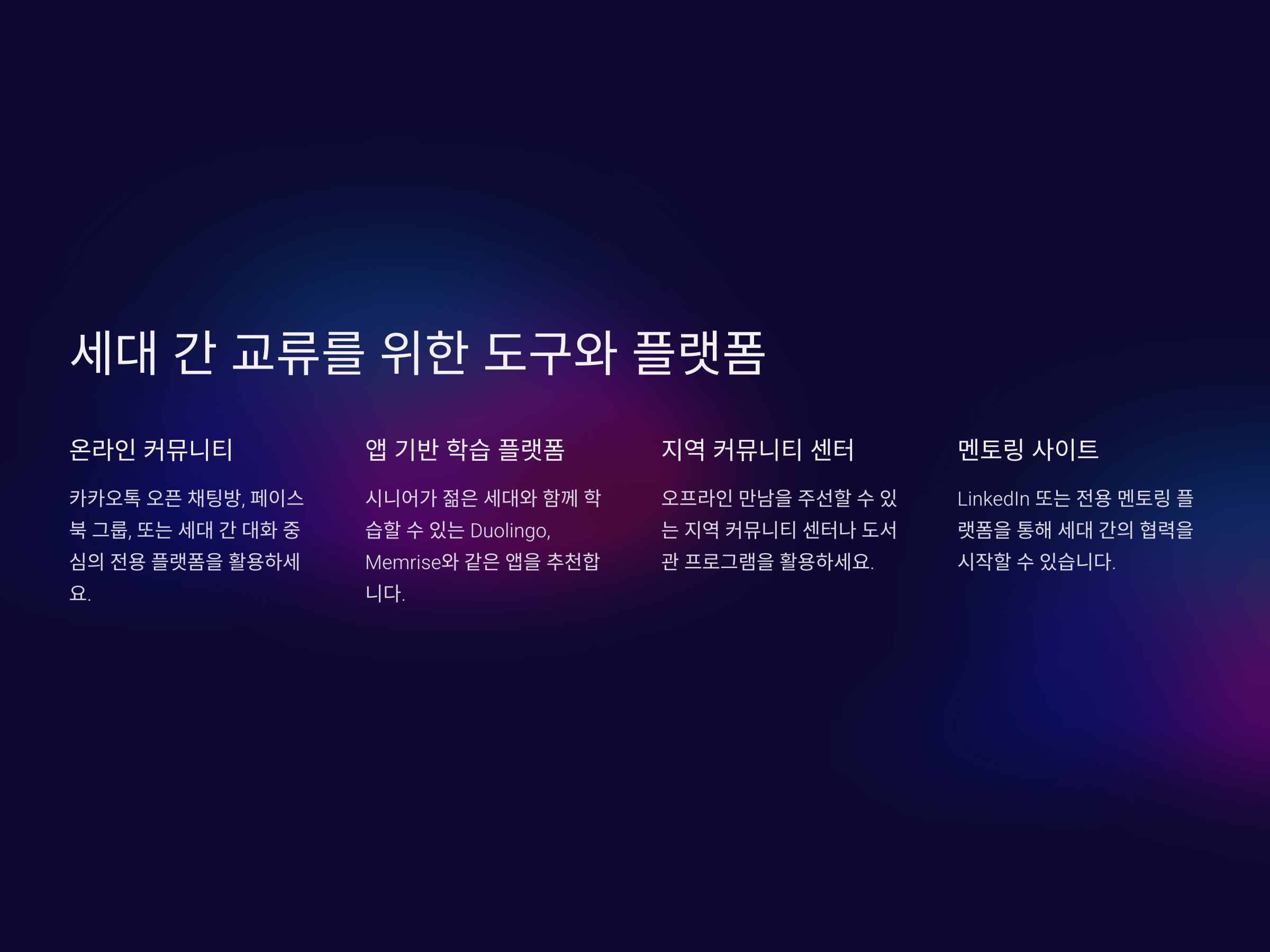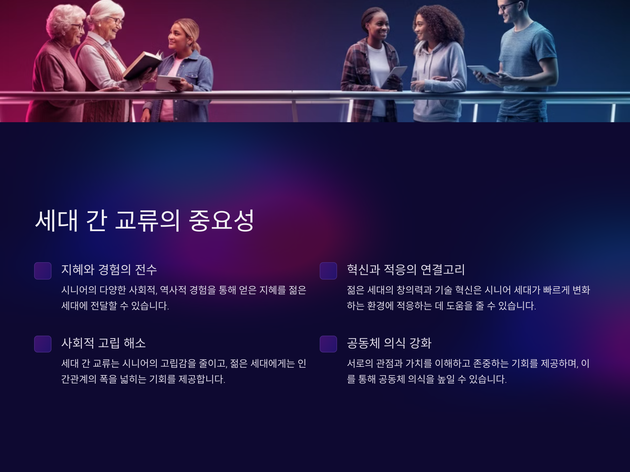 서로 다른 세대가 협력하여 사회적 단절을 해소하고, 더 통합된 사회를 만듭니다.