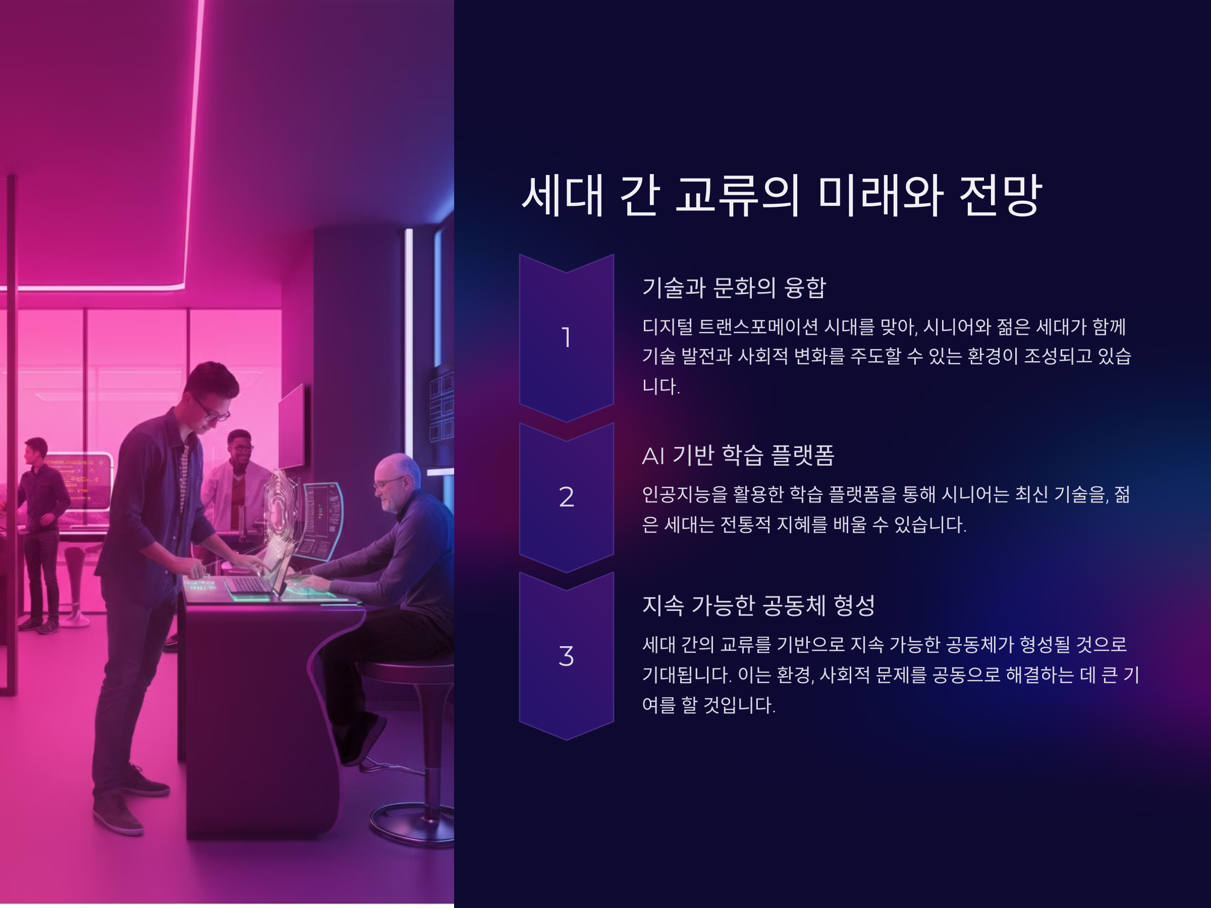 앞으로의 세대 간 교류는 기술과 문화의 융합을 통해 더욱 활발히 이루어질 것입니다. 디지털 트랜스포메이션 시대를 맞아, 시니어와 젊은 세대가 함께 기술 발전과 사회적 변화를 주도할 수 있는 환경이 조성되고 있습니다.