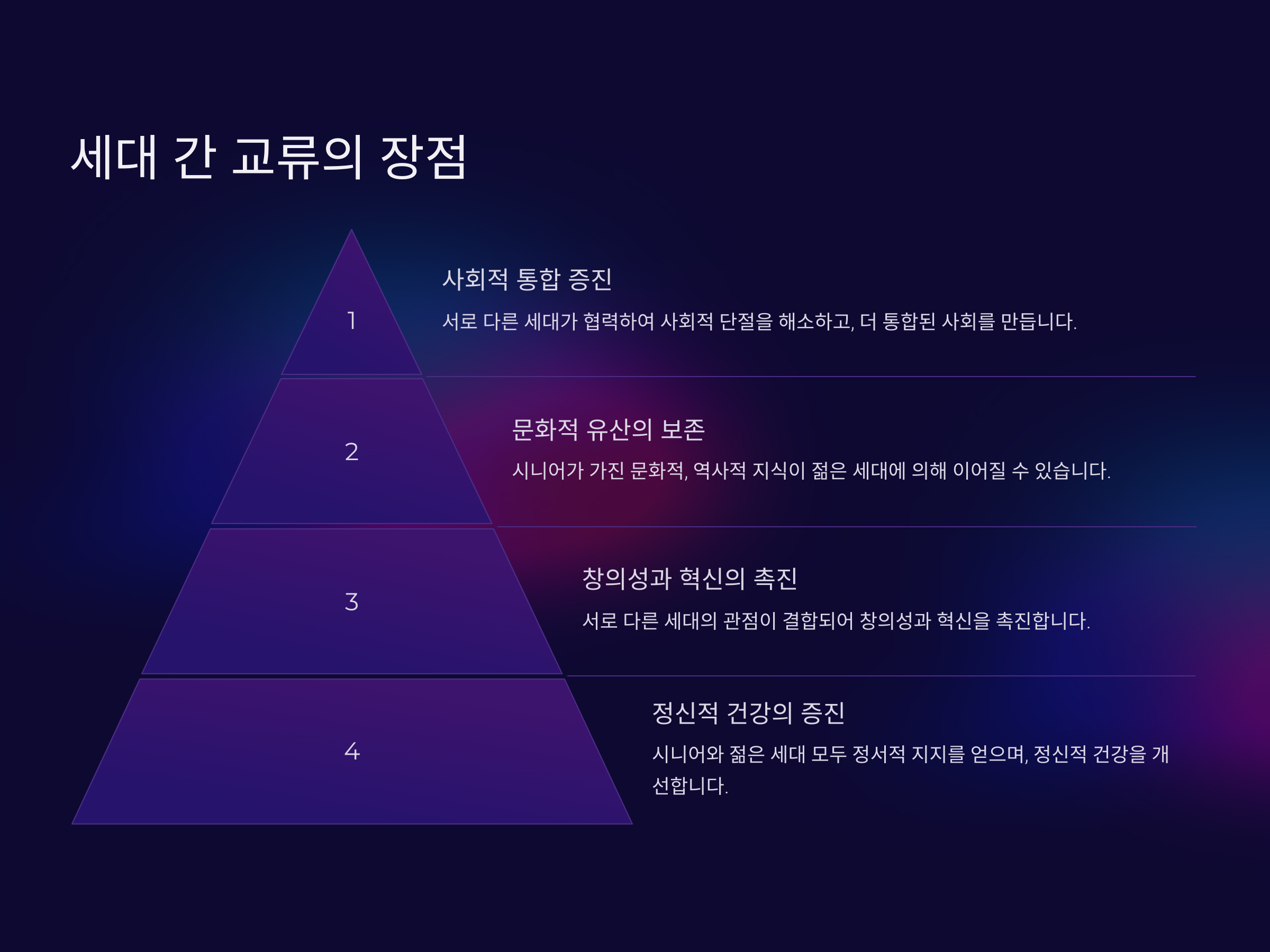 세대 간의 교류는 시니어 세대의 고립감을 줄이고, 젊은 세대에게는 인간관계의 폭을 넓히는 기회를 제공합니다. 이는 모두의 정신적 건강을 증진시킵니다.