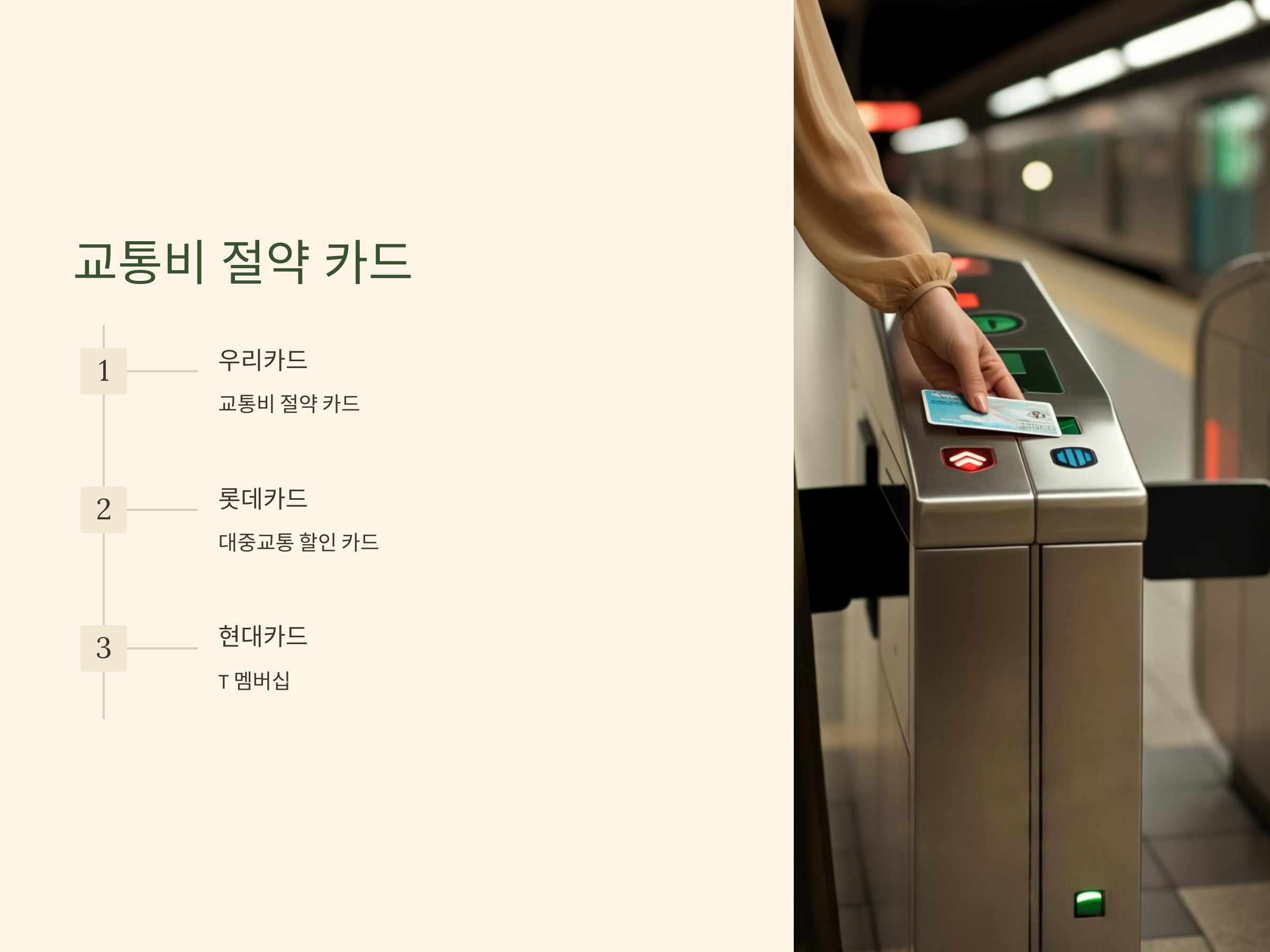- 대중교통 할인 범위: 지하철, 버스 등 대중교통 외에도 일부 카드사는 택시 할인도 제공하므로, 이를 적극적으로 활용하세요.