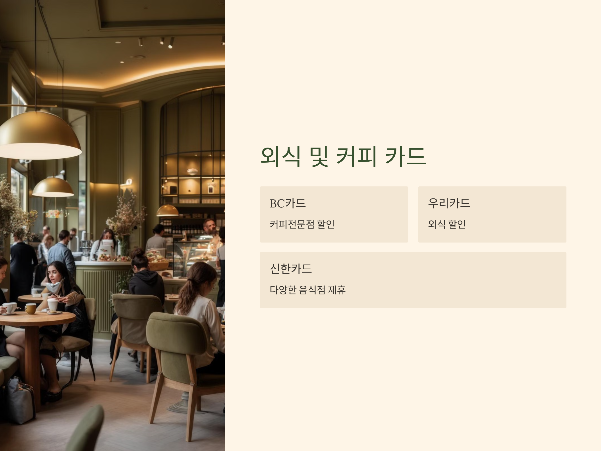 - 외식 및 커피 소비: 자주 외식을 하거나 커피를 즐긴다면, 음식점이나 카페에서 혜택을 제공하는 카드를 찾아야 합니다.