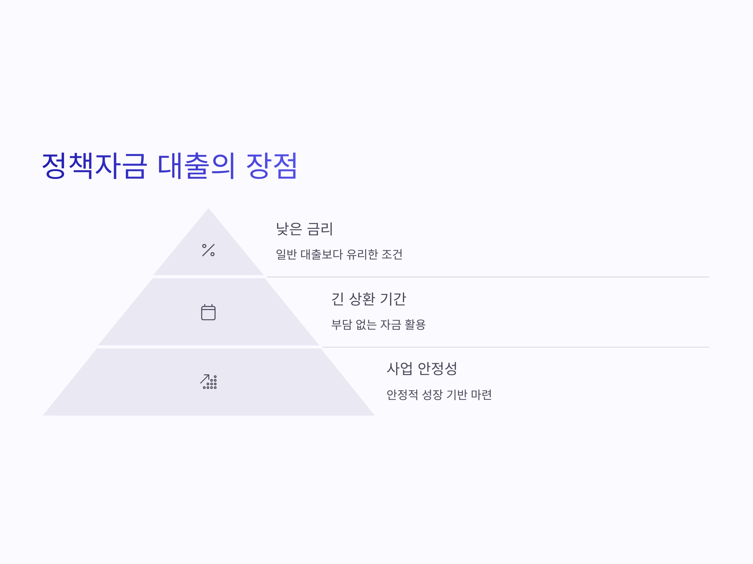 소상공인 정책자금 대출의 가장 큰 장점은 낮은 금리와 유리한 상환 조건입니다. 이는 소상공인들이 대출을 통해 사업을 운영하는 데 드는 부담을 줄이고, 경영 안정을 도울 수 있습니다. 또한, 대출 프로그램에 따라 상환 기간도 길어 사업주가 부담을 덜고 자금을 효율적으로 활용할 수 있습니다.