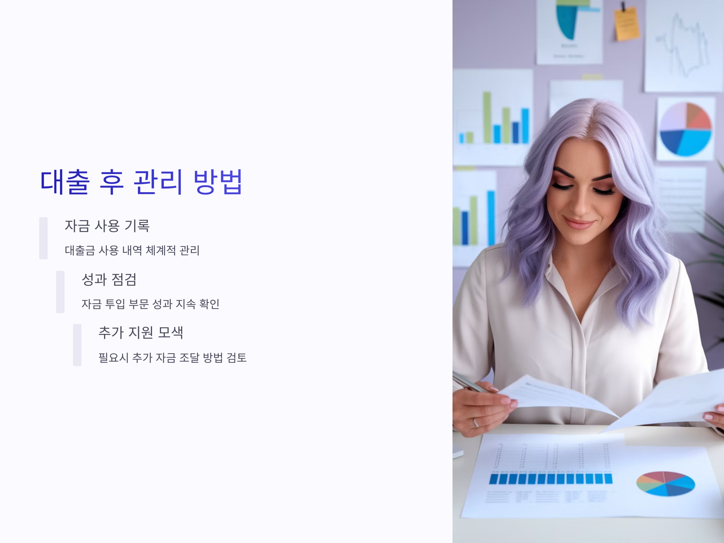 대출을 받은 후에는 자금을 어떻게 관리할지에 대한 계획이 필요합니다. 자금을 효율적으로 운용하지 않으면 사업에 악영향을 미칠 수 있기 때문에, 대출금 사용 내역을 체계적으로 기록하고 관리하는 것이 중요합니다.