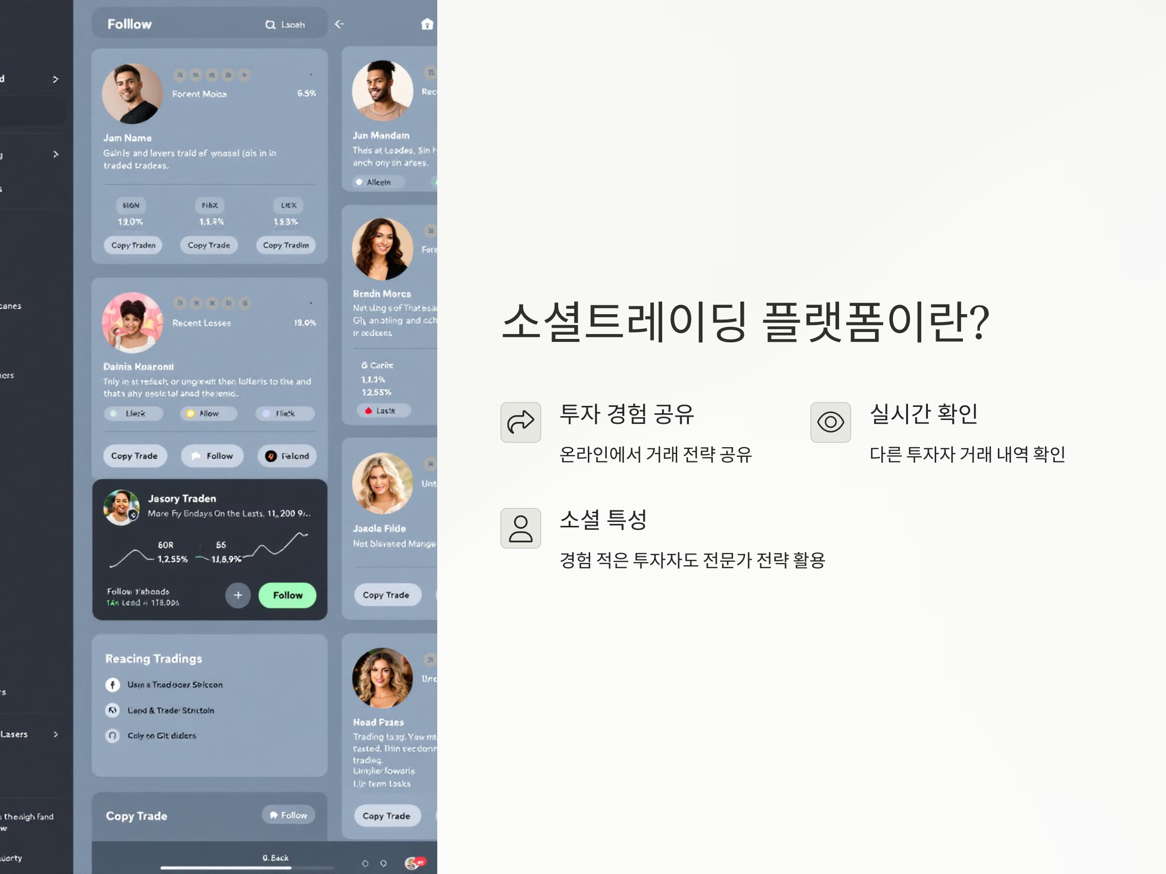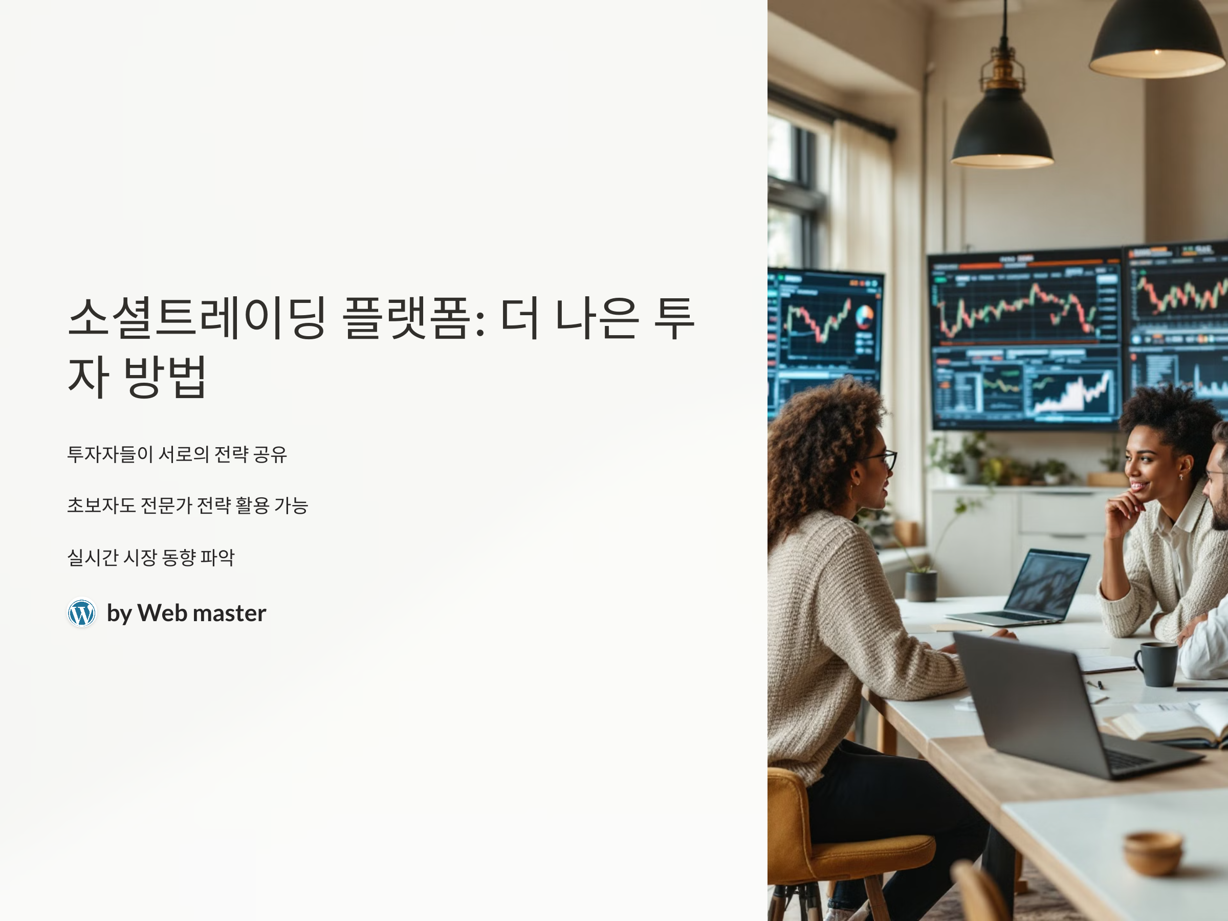 소셜트레이딩의 가장 큰 장점은 투자자들 간의 정보 공유와 경험 공유에 있습니다. 소셜 네트워크처럼 서로의 투자 성과를 확인하고, 이를 바탕으로 자신만의 전략을 세울 수 있기 때문에, 혼자서 시장을 분석하고 투자 결정을 내리는 데 비해 훨씬 효율적이고 빠르게 결정을 내릴 수 있습니다.