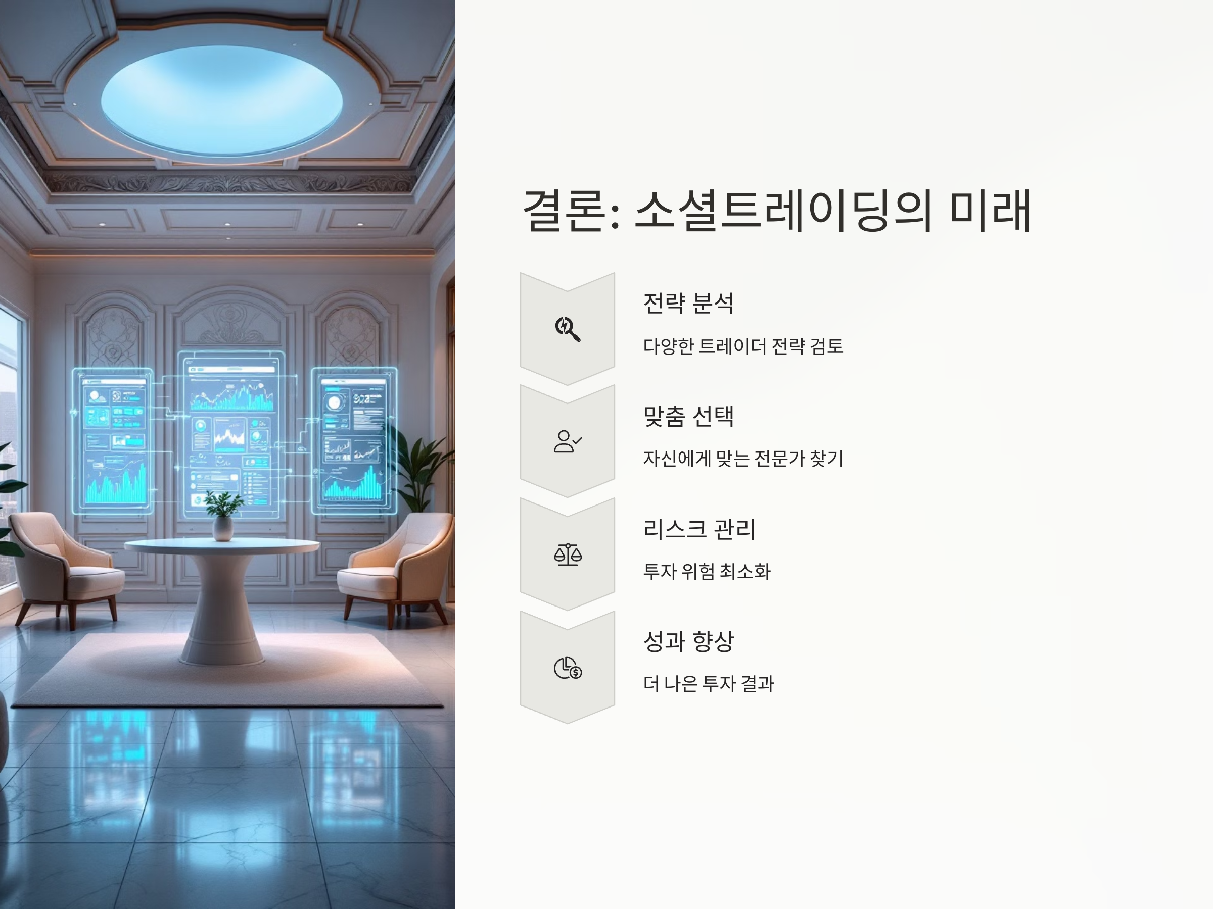 소셜트레이딩은 혁신적인 투자 방법으로, 다양한 투자자들이 서로의 전략을 공유하고, 이를 바탕으로 더 나은 결정을 내릴 수 있게 돕습니다. 경험이 적은 투자자도 전문가들의 전략을 손쉽게 따라 할 수 있어 효율적이고 안전한 투자 방법을 제공합니다. 그러나 소셜트레이딩을 활용할 때는 전략을 선택할 때 신중해야 하며, 리스크 관리가 중요합니다.
