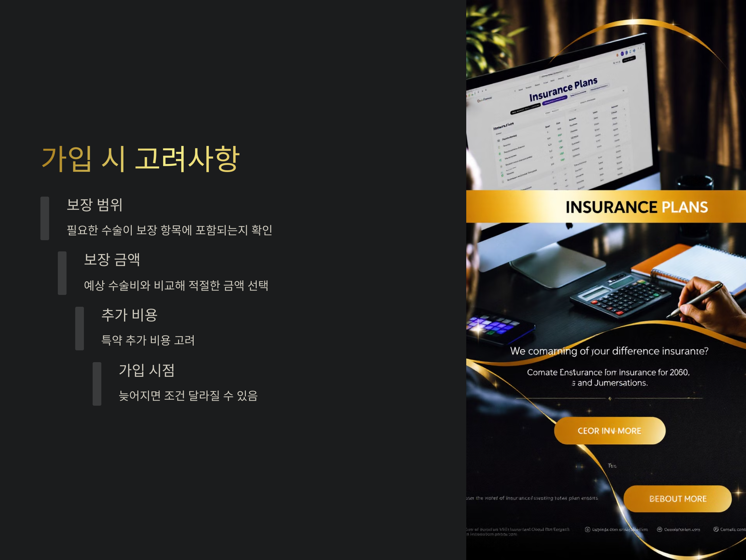 셋째, 특약 추가 비용입니다. 수술비 보장 특약을 추가하는 데는 추가적인 비용이 들 수 있습니다. 비용을 적절히 관리하면서도 충분한 보장을 받을 수 있는 상품을 선택해야 합니다. 마지막으로, 가입 시점도 중요합니다. 보험을 오래 유지할수록 혜택을 많이 받을 수 있지만, 특약을 가입할 시점이 늦어지면, 기존의 건강 상태나 나이에 따라 보장 조건이 달라질 수 있습니다.