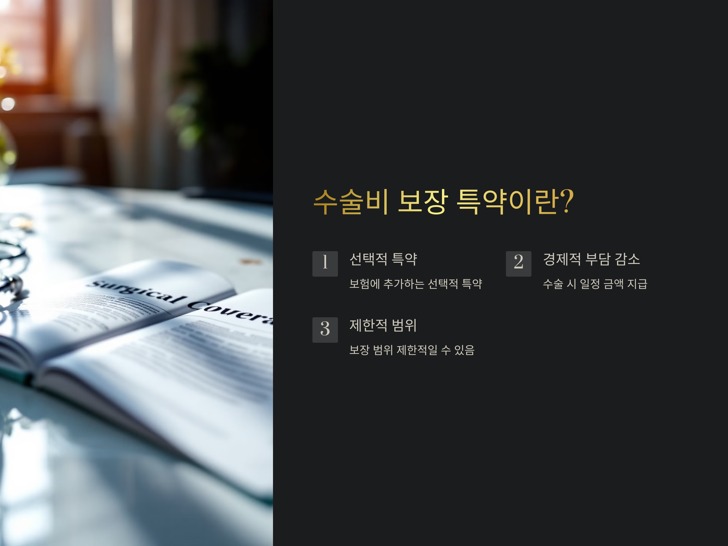 수술비 보장 특약은 보험에 추가하는 선택적 특약으로, 특정 수술을 받을 때 보험사가 그 비용을 일정 금액까지 지급해주는 조건을 담고 있습니다. 이 특약은 질병이나 사고로 인한 수술에 대한 경제적 부담을 줄여주며, 수술 종류에 따라 보장 금액이 달라질 수 있습니다. 중요한 점은 보장하는 수술 범위가 제한적일 수 있기 때문에, 자신이 가입한 보험의 수술비 보장 항목을 꼼꼼히 확인하는 것이 중요합니다. 예를 들어, 어떤 보험사는 내시경 수술 같은 간단한 수술에 대해서는 보장이 안 될 수 있기 때문에, 가입 전 보험 약관을 반드시 확인해야 합니다.