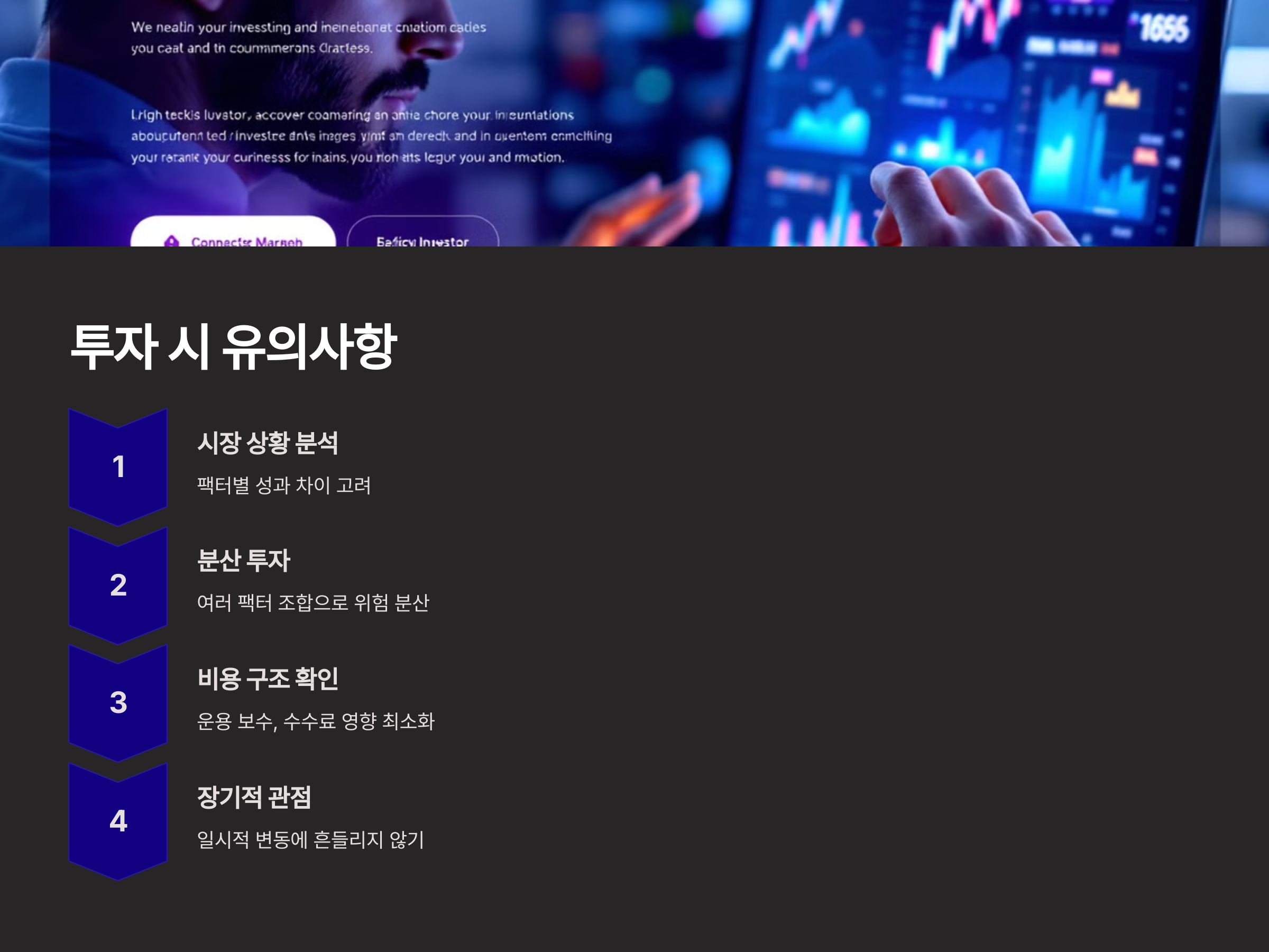 - 시장 상황 분석: 각 팩터는 시장 상황에 따라 성과가 달라질 수 있으므로, 현재 시장 흐름을 파악하고 적합한 전략을 선택해야 합니다.