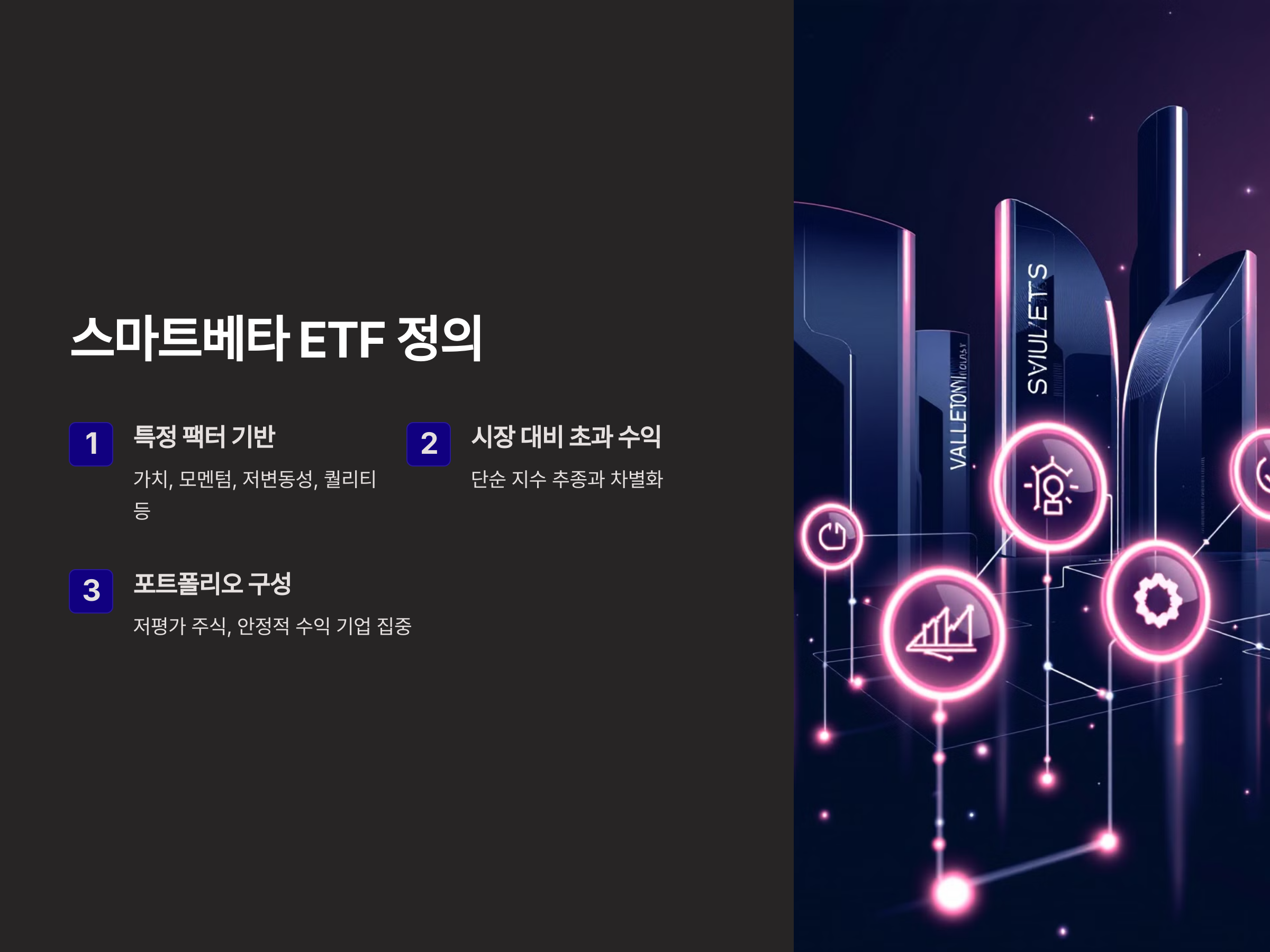 스마트베타 ETF는 시장 지수를 단순 추종하는 패시브 ETF와 달리, 특정 팩터(요인)를 기반으로 포트폴리오를 구성하여 시장 대비 초과 수익을 추구하는 투자 상품입니다. 이러한 팩터에는 가치(Value), 모멘텀(Momentum), 저변동성(Low Volatility), 퀄리티(Quality) 등이 포함됩니다. 예를 들어, 저평가된 주식이나 안정적인 수익을 내는 기업에 집중 투자하는 방식입니다.