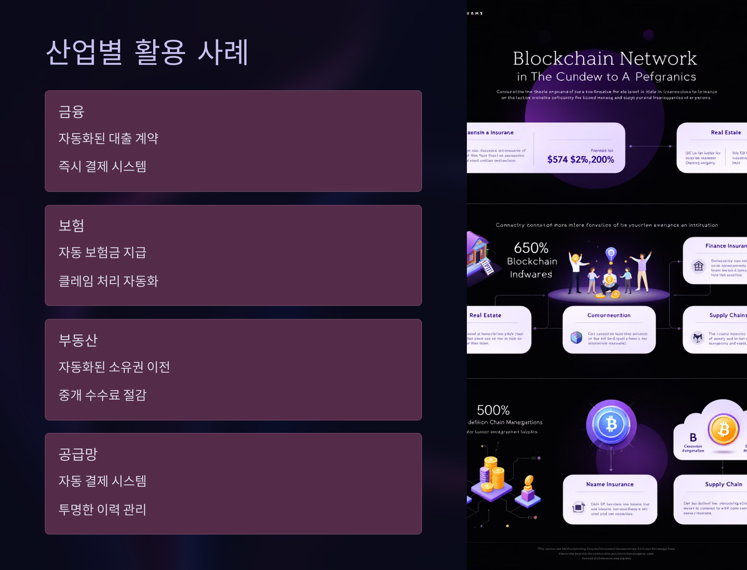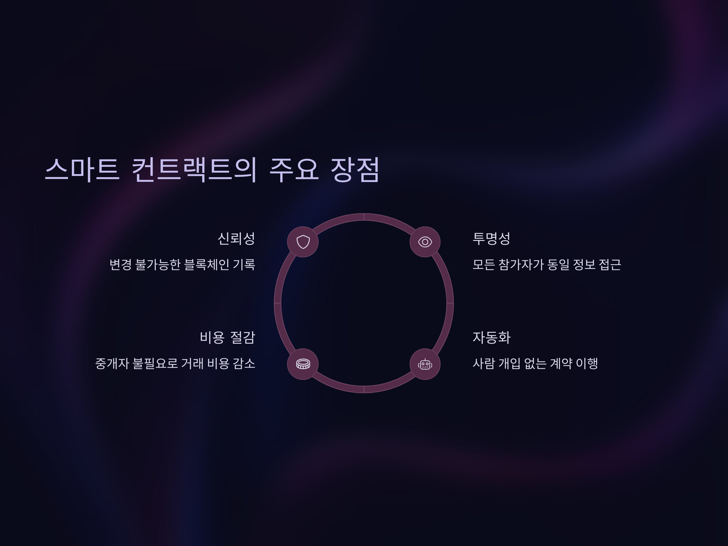 스마트 컨트랙트의 가장 큰 장점은 그 자동화된 특성입니다. 계약 조건이 충족되면 프로그램에 의해 자동으로 실행되기 때문에 사람의 개입 없이 계약이 성실히 이행됩니다. 이러한 시스템은 금융, 보험, 부동산 거래, 공급망 관리 등 다양한 분야에서 적용되고 있으며, 계약 과정에서 발생할 수 있는 시간을 절약하고 비용을 절감하는 데 기여합니다.