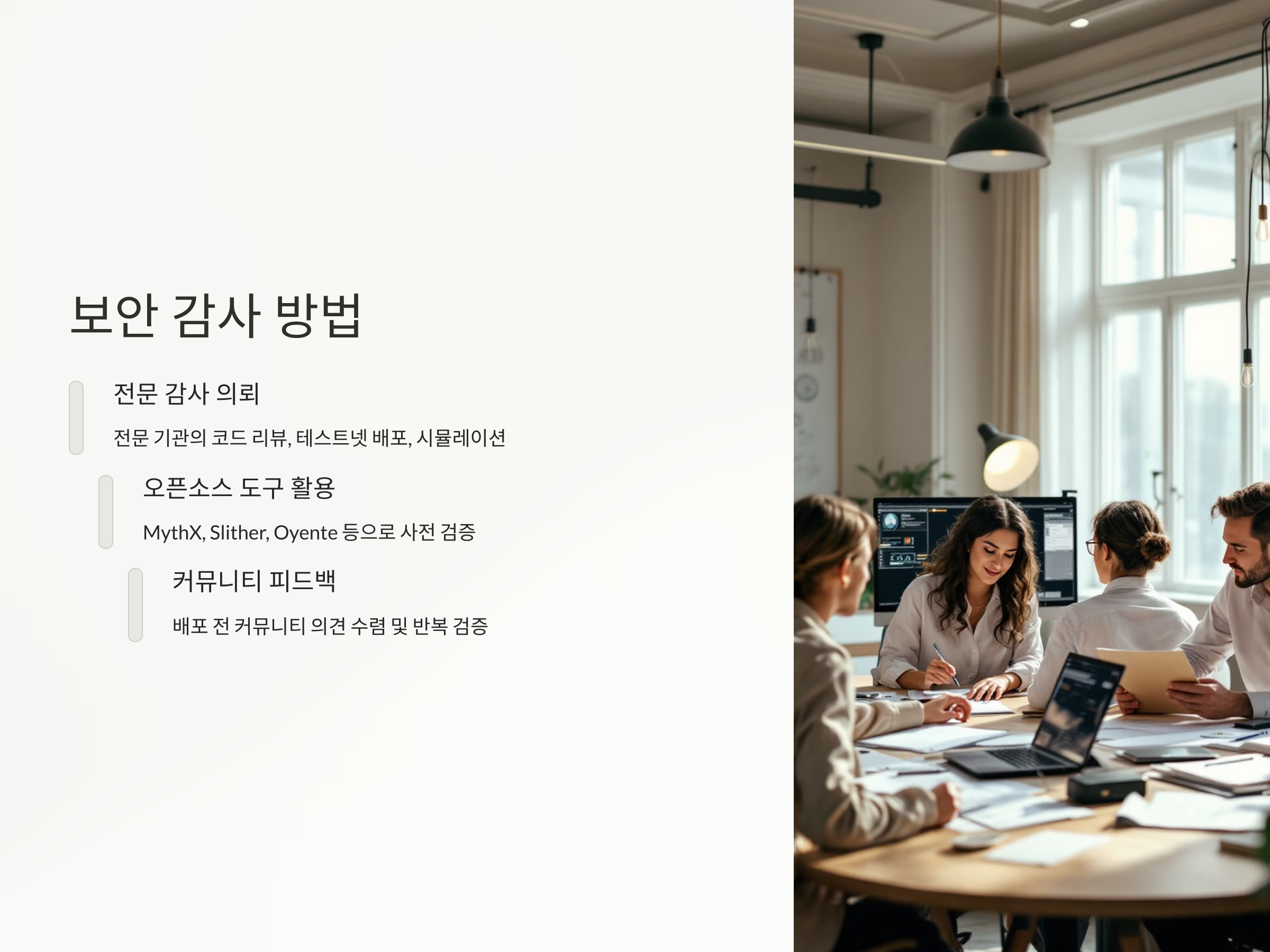 스마트 컨트랙트 개발 후에는 반드시 보안 감사를 받아야 합니다. 전문 감사 기관에서는 코드 리뷰, 테스트넷 배포, 시뮬레이션 등을 통해 취약점을 진단합니다. 또한, 개발자는 오픈소스 도구인 MythX, Slither, Oyente 등을 활용해 사전 검증을 진행할 수 있습니다. 코드 배포 전 철저한 사전 검토가 필요하며, 커뮤니티에서의 피드백 수집도 중요합니다. 반복적인 검증과 수정만이 스마트 컨트랙트의 안전성을 높일 수 있는 방법입니다.