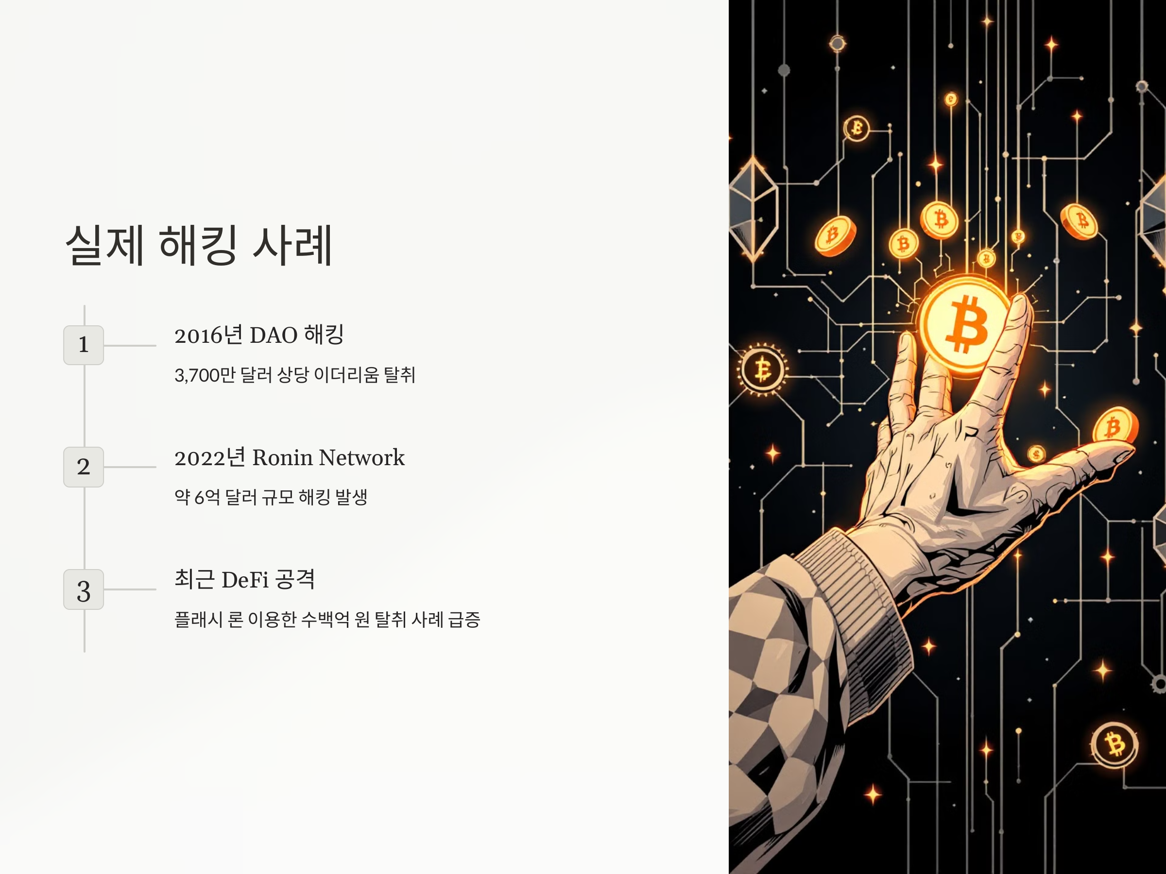 스마트 컨트랙트의 취약점은 실제로 대형 사고로 이어졌습니다. 가장 유명한 것은 2016년 DAO 해킹 사건으로, 약 3,700만 달러 상당의 이더리움이 탈취됐습니다. 2022년에는 Ronin Network 해킹으로 약 6억 달러가 탈취되는 등 해킹 규모도 점점 커지고 있습니다. 특히 최근에는 디파이 프로토콜에서 플래시 론을 이용한 공격이 급증하며, 짧은 시간 안에 수백억 원이 탈취되는 사례가 속출하고 있습니다. 이렇듯 스마트 컨트랙트 해킹은 단순히 개발자 실수에서 끝나지 않고, 수많은 이용자의 자산에 큰 피해를 주기 때문에 반드시 주의가 필요합니다.