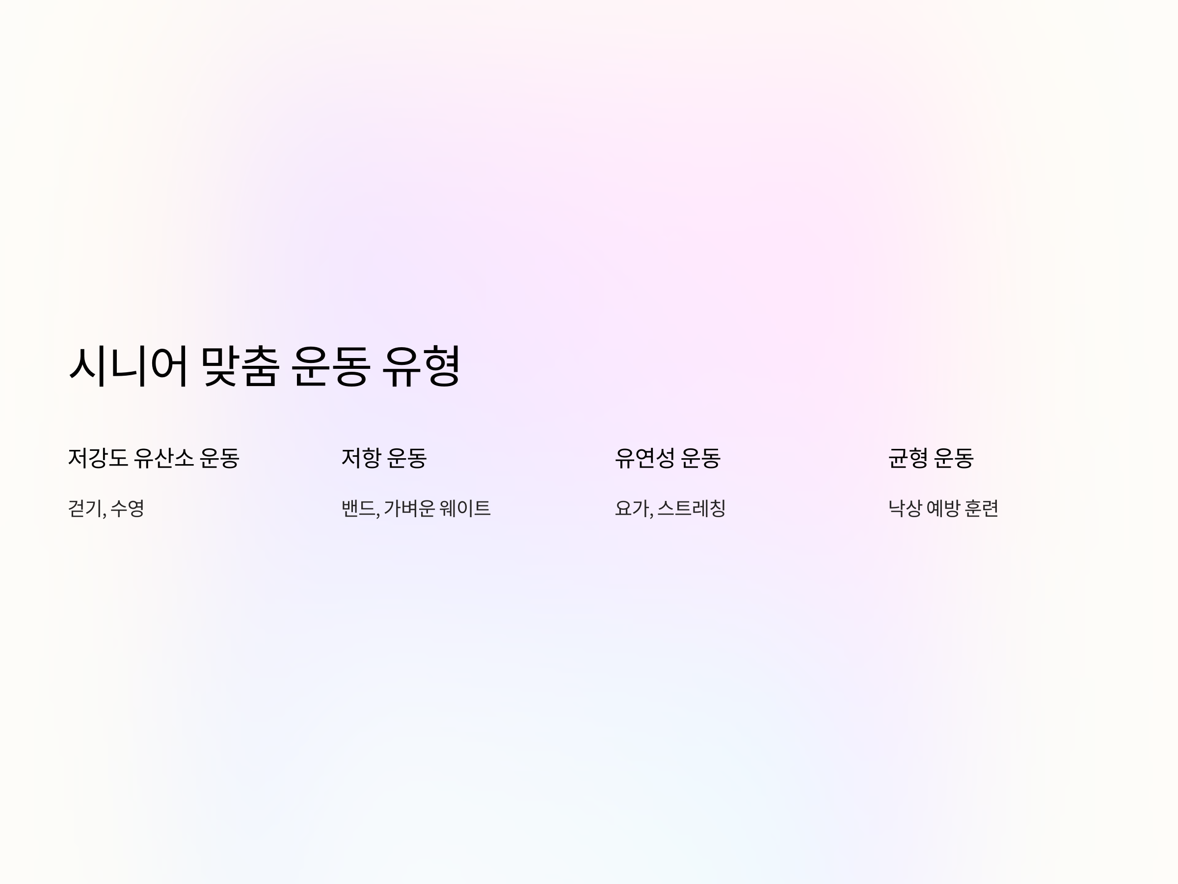 시니어에게 적합한 운동은 신체적 요구와 건강 상태를 충족해야 합니다. 다음은 일반적으로 추천되는 운동 유형들입니다.
