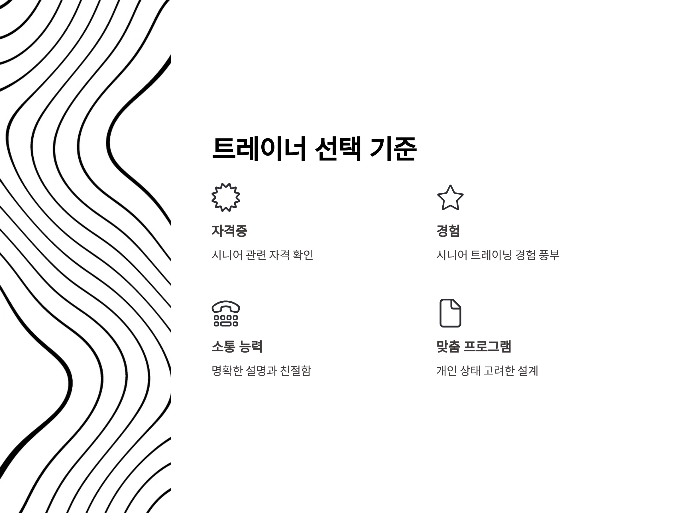 - 경험: 시니어를 대상으로 한 트레이닝 경험이 풍부한지 확인해야 합니다.